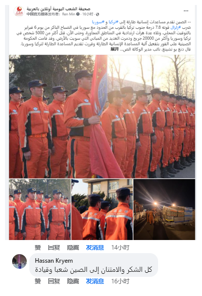 阿拉伯网友哈桑在人民网阿文频道贴文《中国向土叙两国提供紧急人道主义援助》下留言:非常感谢中国人民和中国领导人。