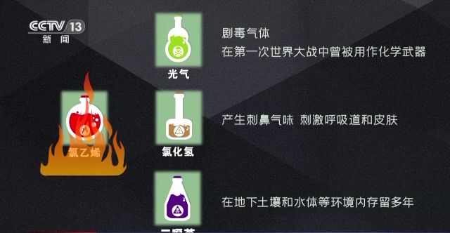 美国国家癌症研究所指出,氯乙烯燃烧时可产生光气、氯化氢和二噁英等有害物质。光气是一种剧毒气体,在第一次世界大战中曾被用作化学武器;氯化氢会产生刺鼻气味,刺激呼吸道和皮肤。而二噁英则可以在地下土壤和水体等环境内存留在多年。