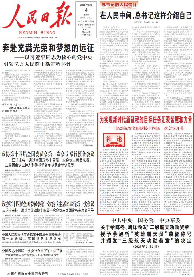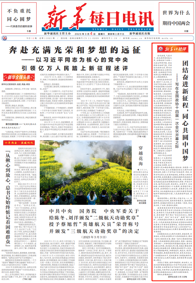今日(3月4日)出版的人民日报、新华每日电讯、光明日报刊发社论,热烈祝贺大会胜利开幕。