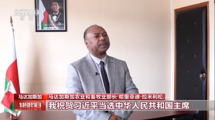 马达加斯加农业和畜牧业部长 哈里菲迪·拉米利松:我祝贺习近平当选中华人民共和国主席,我希望中国人民继续走在繁荣昌盛的道路上。