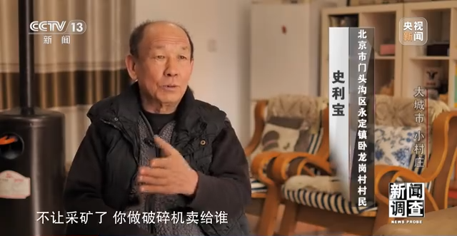 北京市门头沟区永定镇卧龙岗村村民 史利宝:后来国家不让采矿了,所以到那时候我又到了一个瓶颈,不让采矿了,你做破碎机卖给谁?所以没活了我也就不干了,这就接近到我现在这个年龄了,到老了,就干不动了。其实我也是用了一辈子的事就买一套房子这么点能力,这只是咱们还是没干纯农业,没有纯属务工,你纯属务工干农业的,买商品房是永远没有戏的。