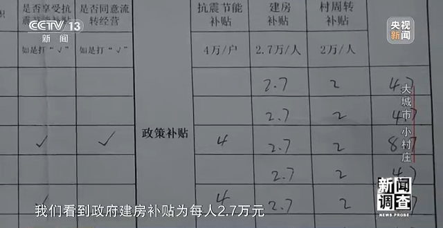 在这份统计单的政策补贴一栏,我们看到政府建房补贴为每人2.7万元,村周转补贴为每人2万元。房屋建成后,庞福全家7口人一共可以获得40.9万元的补贴奖励资金。按照政策,他家可以翻建四座二层小院,但建房多出的金额则需要村民自己承担。