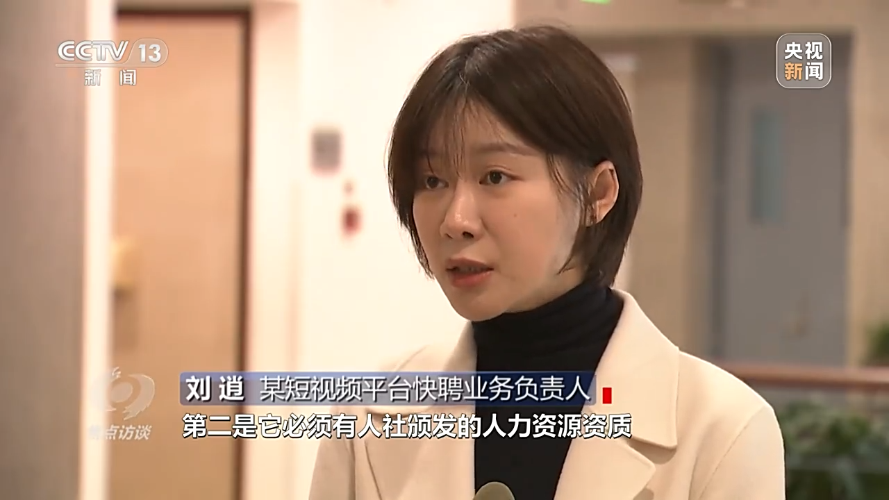 某短视频平台快聘业务负责人 刘逍:企业必须有相关资质才能做直播带岗这个服务,包含基本工商备案的一些营业资质,第二必须有人社颁发的人力资源资质,我们才会让这个企业完成入驻。入驻一段时间之后我们会根据直播内容、短视频内容和带岗后面的内容,比如反馈的效率和跟用户沟通了什么等,去持续考核它是不是继续可以在平台做下去。