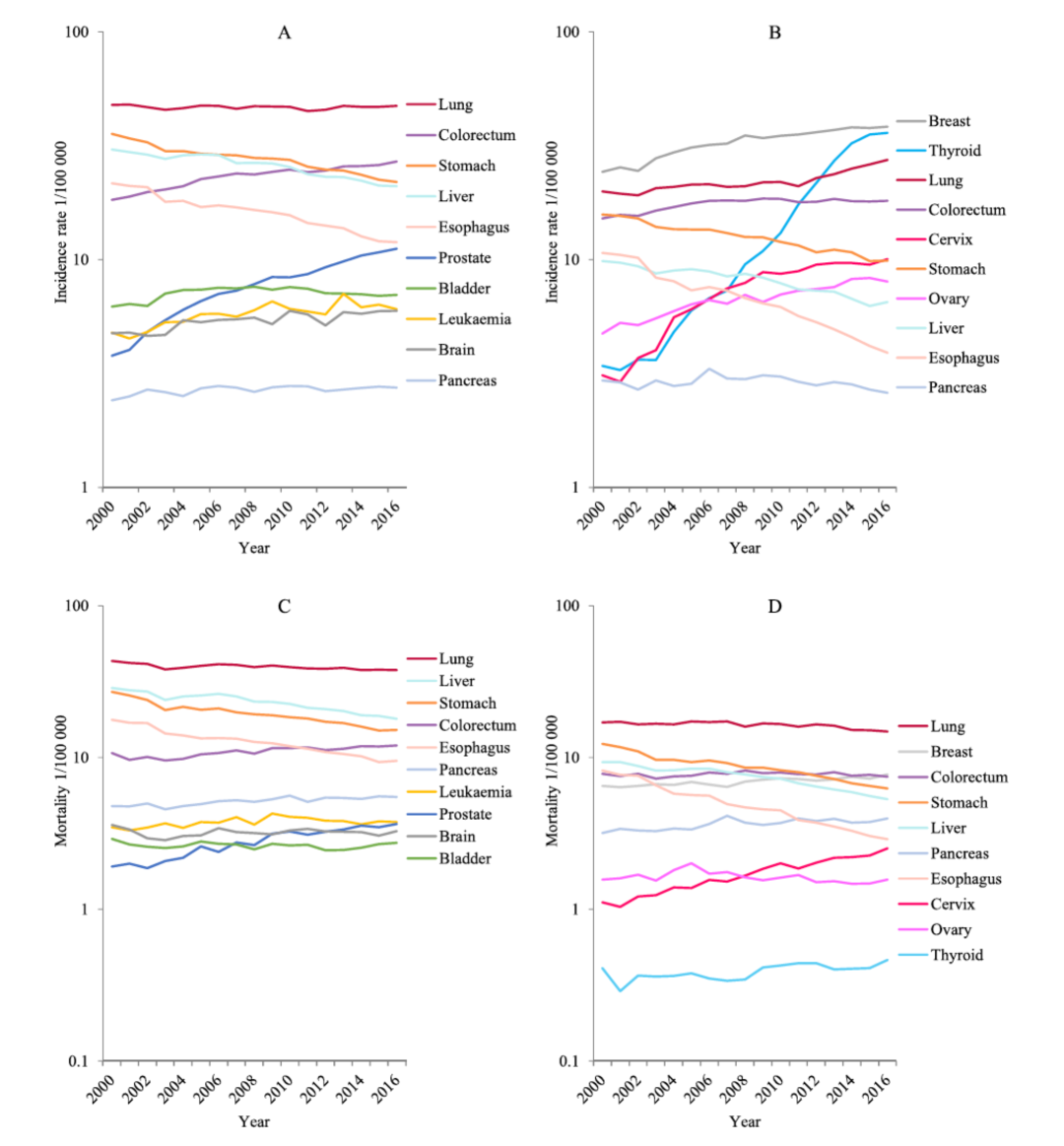 根据所发表的数据[2],不管是发病率还是死亡率,男性的结直肠癌和前列腺癌,以及女性的宫颈癌,都在逐年增加。