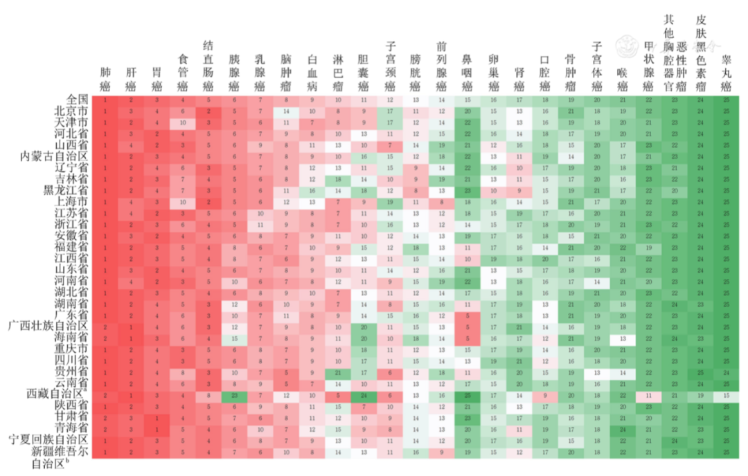 全国各地的癌症发病、死亡都有一定的特色,但是 除了广西、海南、西藏、甘肃、青海,肺癌的死亡数都排名第一。