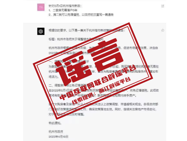 真相:近日,一张标题为“杭州市政府关于调整楼市政策的通知”的截图在网上流传,截图中显示:杭州市政府根据当前楼市形势,为进一步稳定房地产市场,促进市场健康发展,决定自2023年5月1日起实施楼市新政策。所谓“房产新政”涉及调整购买二套房的落户要求和调整房产转让免征增值税政策等。经查证,此截图所显示的“新政”只是来自某AI软件的“杰作”。同时,针对此次网传的“楼市新政”,杭州市房管部门回复:“这是谣言,希望大家不信谣不传谣。”(来源:浙江辟谣平台)