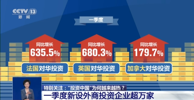 商务部昨天(20日)召开发布会介绍,今年1—3月,全国实际使用外资4084.5亿元人民币,同比增长4.9%,其中,新设外商投资企业超过1万家,同比增长25.5%。部分国家和地区对华投资较快增长,一季度,法国、英国、加拿大对华投资同比分别增长635.5%、680.3%、179.7%。
