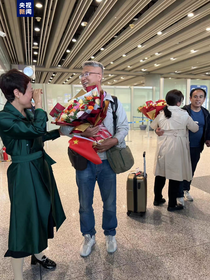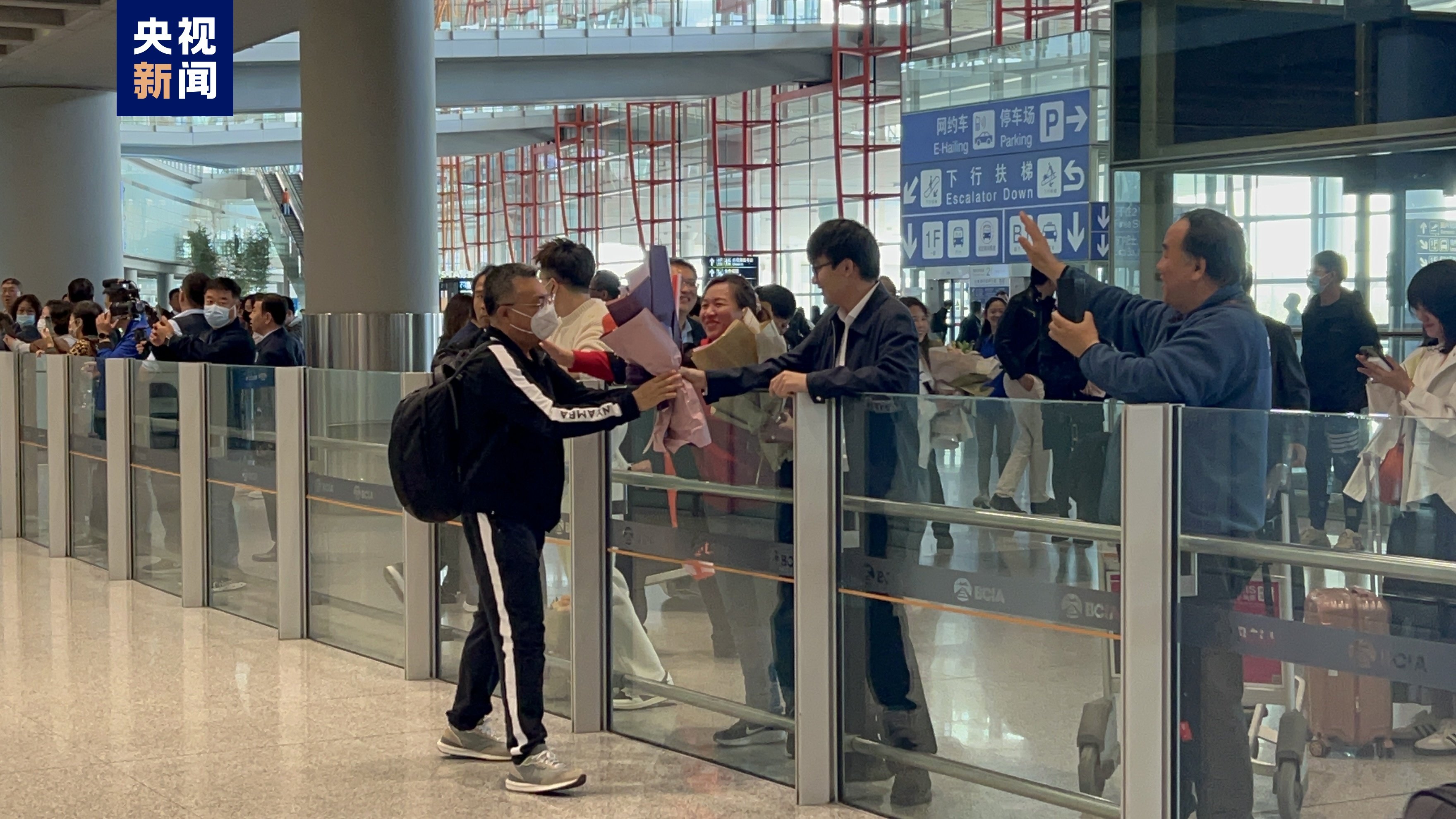在首都机场T3国际到达大厅,归国人员与亲朋好友团聚时,难掩内心的激动与喜悦。