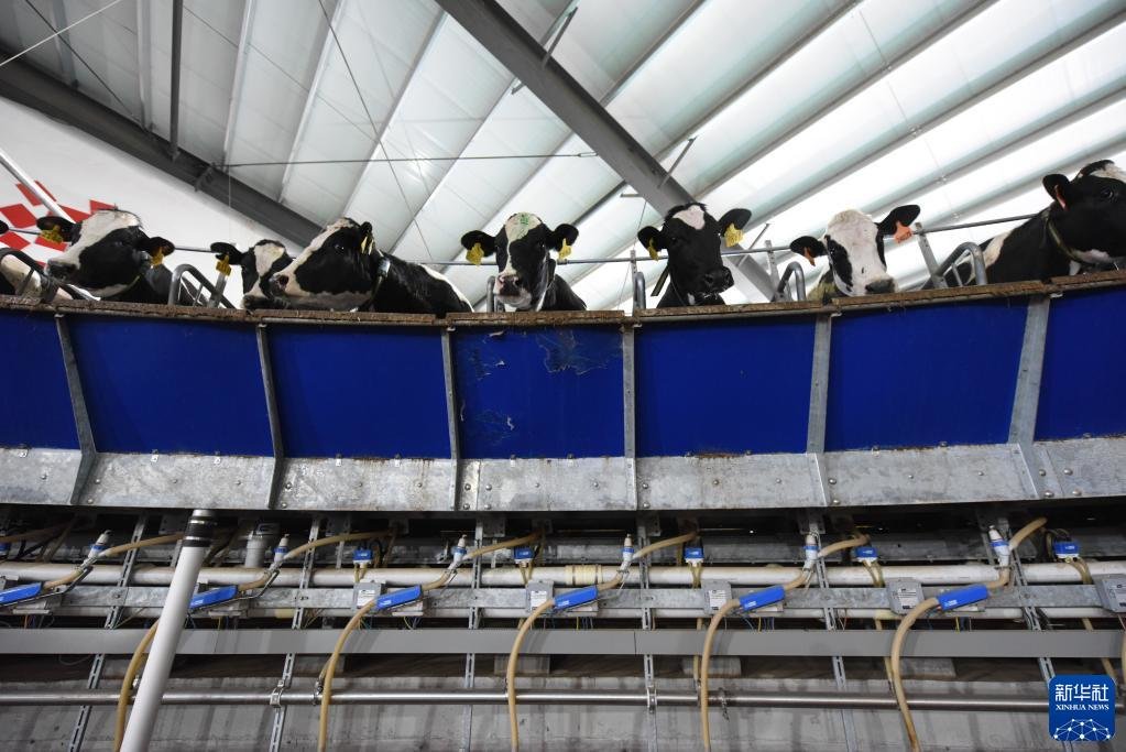 5月7日,在甘肃武威金宇浩睿农牧产业园,戴着“运动项圈”和电子耳标的奶牛经过扫描,进入转盘式挤奶机。
