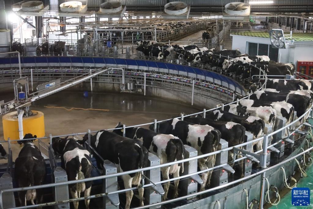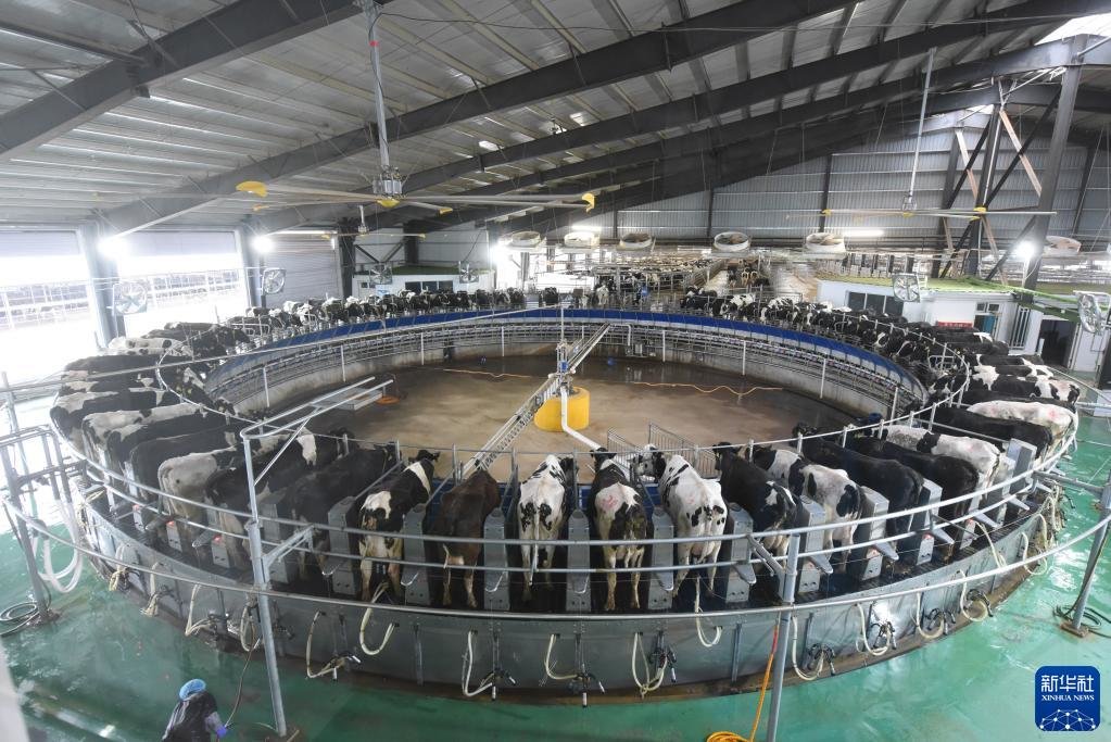 5月7日,在甘肃武威金宇浩睿农牧产业园,奶牛在转盘式挤奶机上产奶。