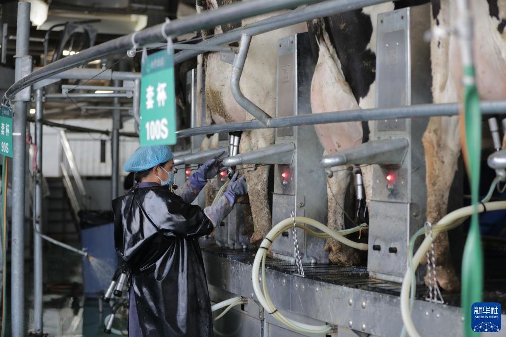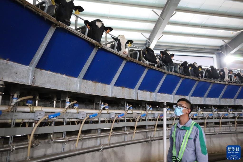 5月7日,在甘肃武威金宇浩睿农牧产业园,工作人员查看转盘式挤奶机工作情况。