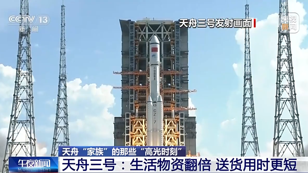 2021年9月20日,天舟三号发射成功。与天舟二号相比,天舟三号飞船携带的生活物资翻了一倍,可以满足3名航天员在空间站驻留6个月的生活所需。