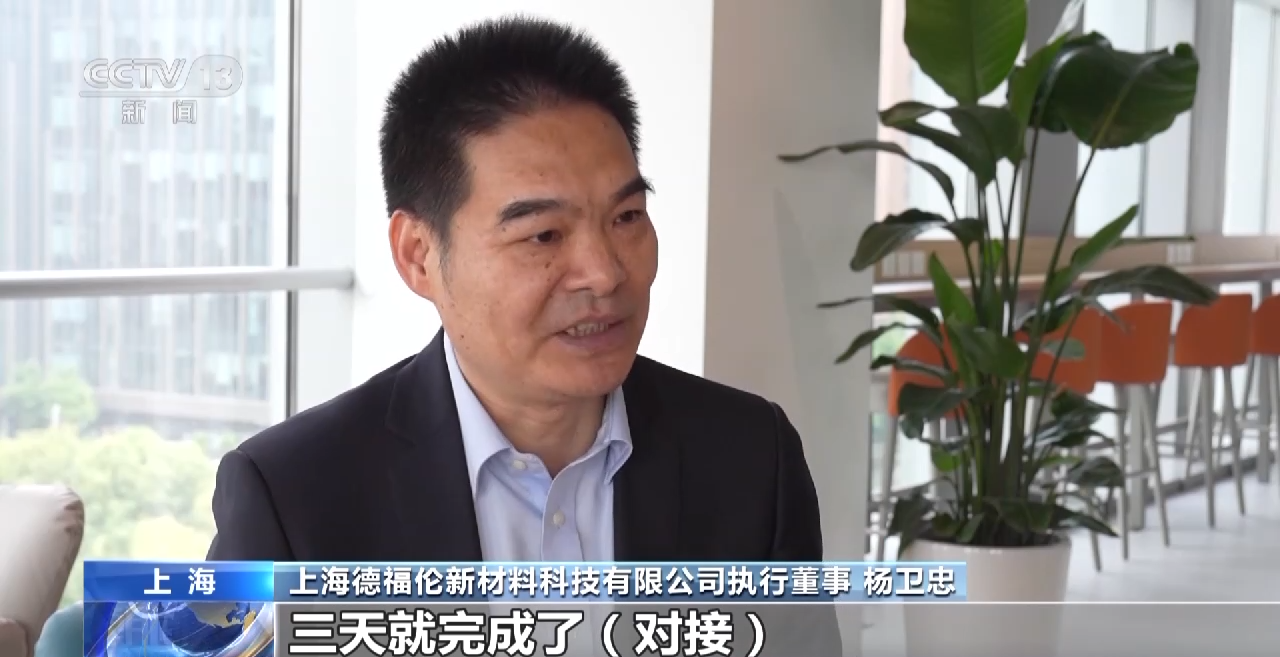 上海德福伦新材料科技有限公司执行董事 杨卫忠:想不到这么快、三天就完成了对接,也想不到实际上我们的需求,人家已经早就有所研究,只是我们没有发现。