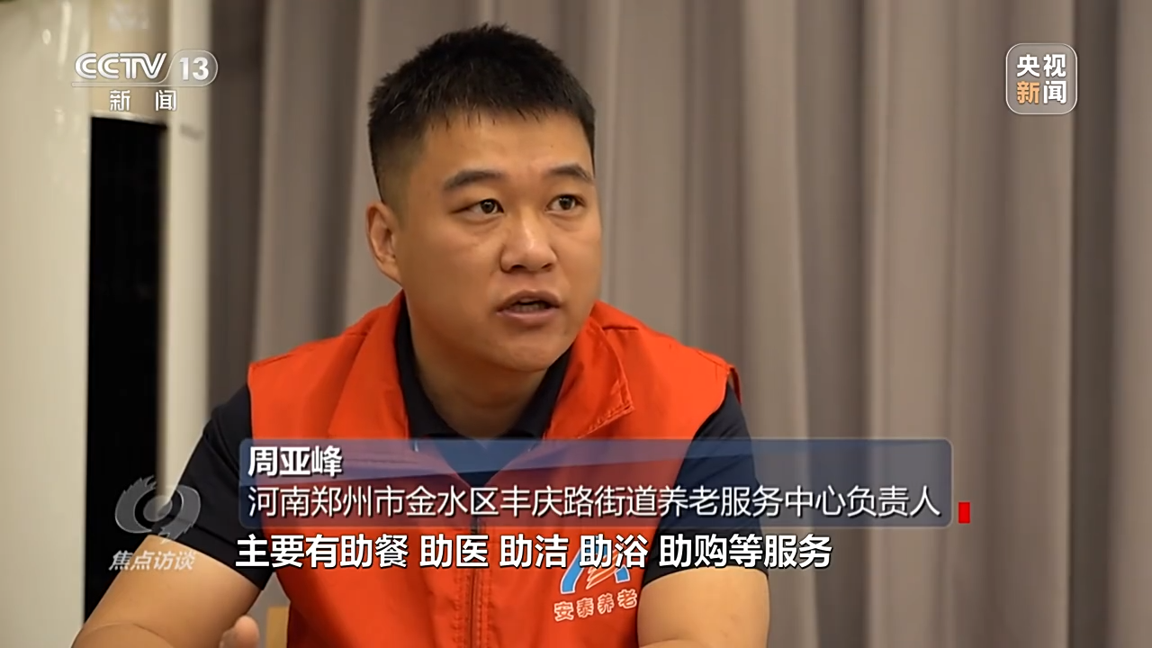 河南郑州市金水区丰庆路街道养老服务中心负责人 周亚峰:我们主要为居家老人提供两护六助等服务,有助餐、助医、助洁、助浴、助购等服务,也为老人提供居家巡访和视频巡访。