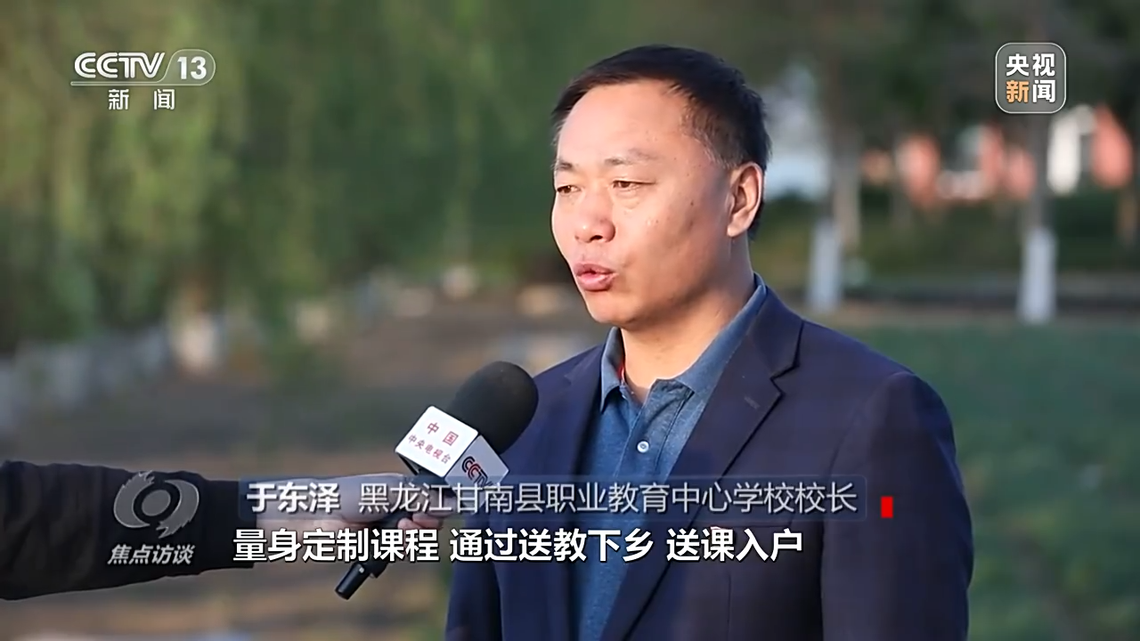 黑龙江甘南县职业教育中心学校校长 于东泽:近些年,学校开展了新兴职业农民培养工作,通过走村入户调研了解农民需求,量身定制课程,通过送教下乡,送课入户,把课堂开在村头、地头、炕头。几年来累计培养新型职业农民近4000人,其中致富带头人达300余人。