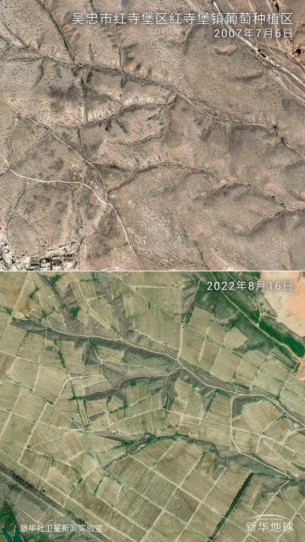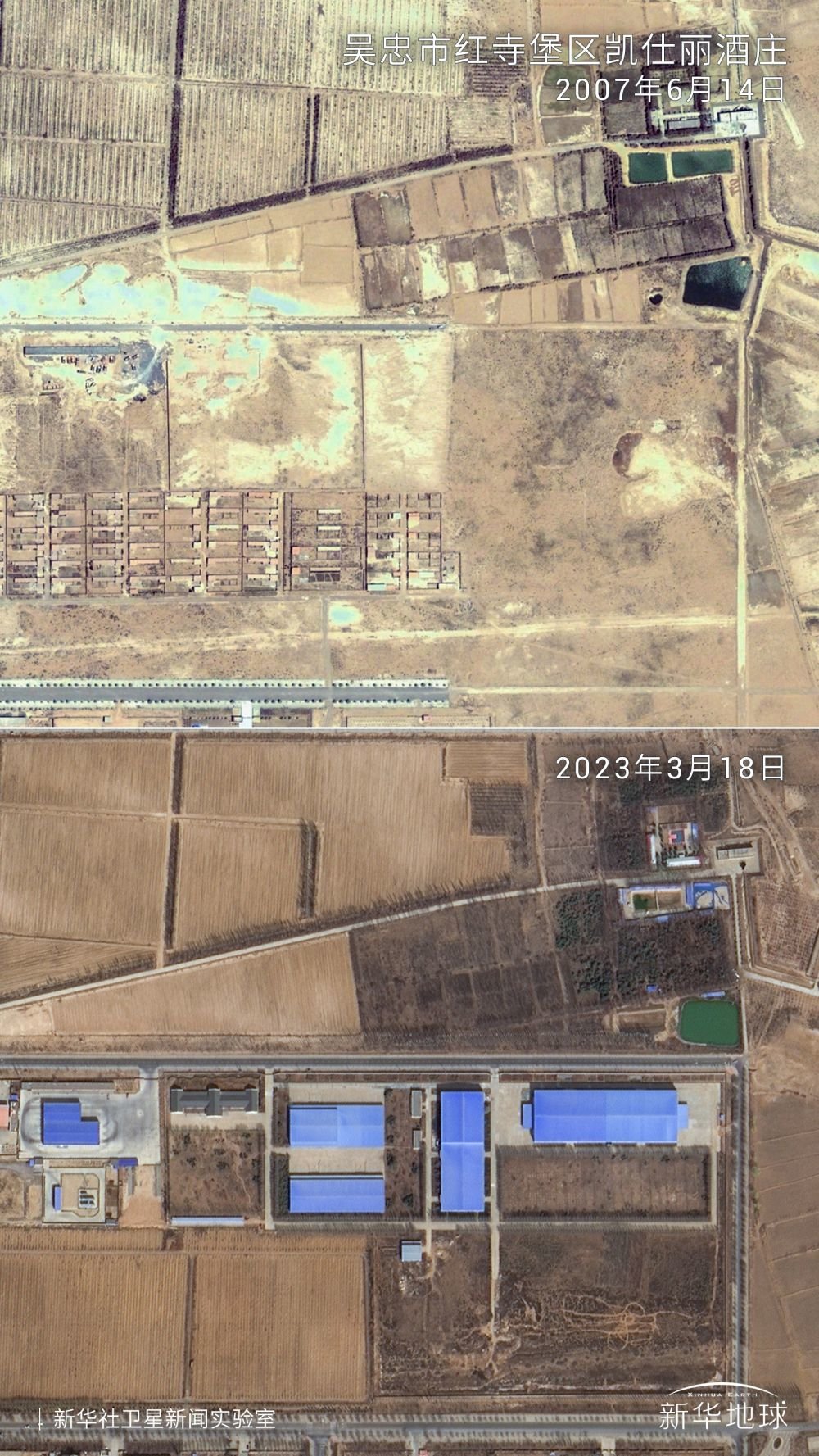 新华社北京6月8日电 宁夏贺兰山东麓位于北纬37度至39度,是世界公认的酿酒葡萄种植“黄金地带”。曾经遍布砾石的戈壁荒滩,如今变成草木葱郁的葡萄园。一座座散发着美学魅力的酒庄建筑、一条条现代化的葡萄酒生产线,合力打造出宁夏耀眼的“紫色名片”。借助卫星图片,可以更加直观地感受戈壁滩上孕育出的葡萄酒产业奇迹。