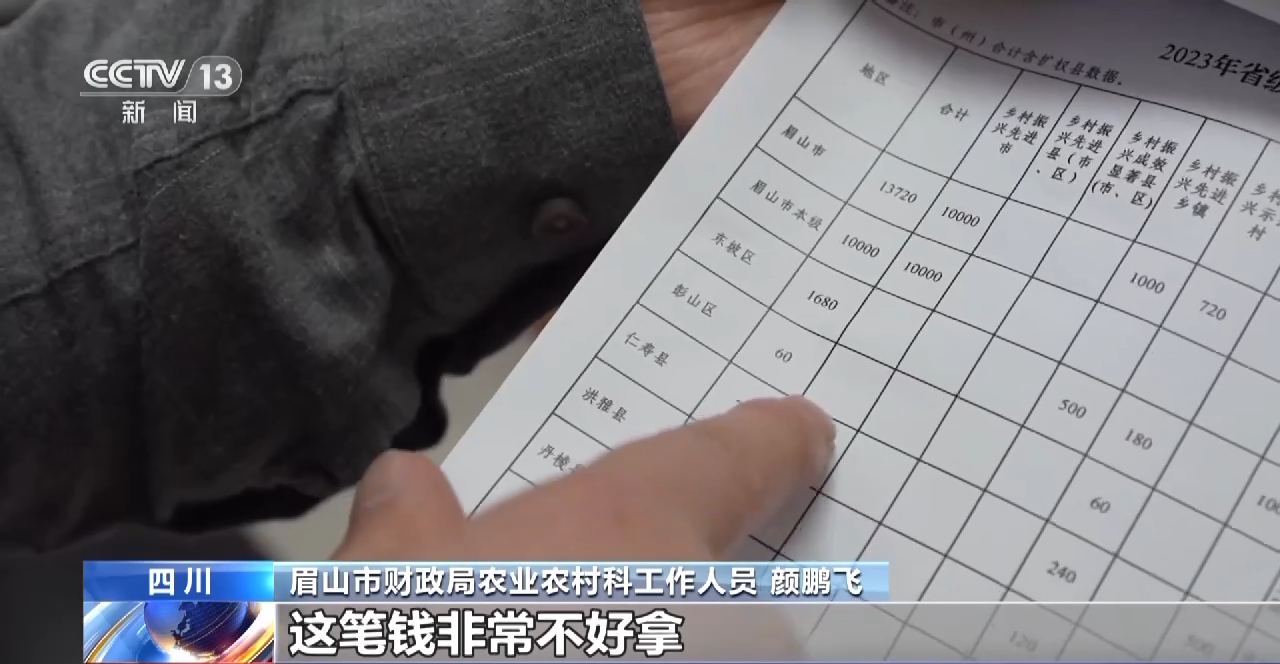 眉山市财政局农业农村科工作人员 颜鹏飞:这笔钱非常不好拿。比如说,你的农田是高标准农田吗?是改造的吗?改造之后单产提升有多少?现在要改卫生厕所,你们以前有多少个厕所不是卫生的,这次改了几个?还剩多少?量化指标就有了。