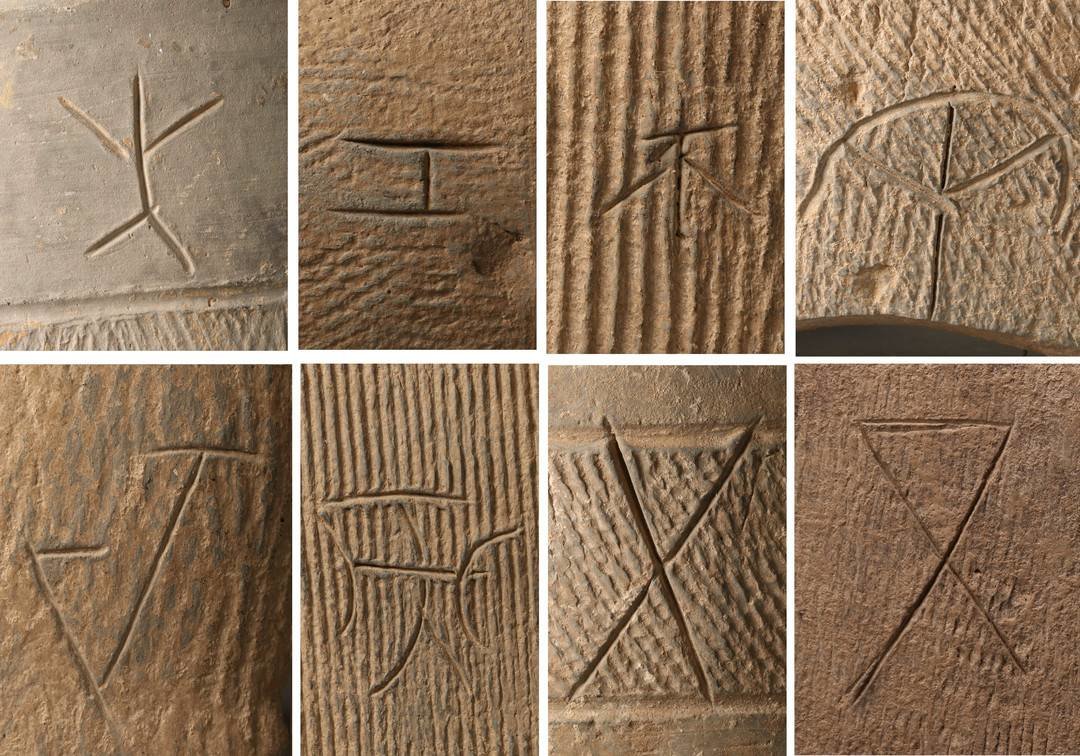 遗址出土器物以春秋时期建筑材料为主,均为泥质灰陶,主要有槽形板瓦、筒瓦、半圆形瓦当等,在建筑材料表面发现大量刻划符号,数量达183件。槽形板瓦一端宽,一端窄,瓦面略呈弧形,两侧向上圆角折出,切割痕迹明显,截面呈凹槽形,表面饰绳纹。筒瓦瓦背饰以凹弦纹隔开的绳纹带及素面带,相间分布,瓦沟素面。刻划符号既有文字“五”“十”“又”“工”“木”“火”等,也有难于辨认的符号。部分文字或符号出土有多件,形制相同。刻划符号长1.3-6.6厘米、宽1-5.4厘米。这些刻划符号可能是物勒工名的早期形态。