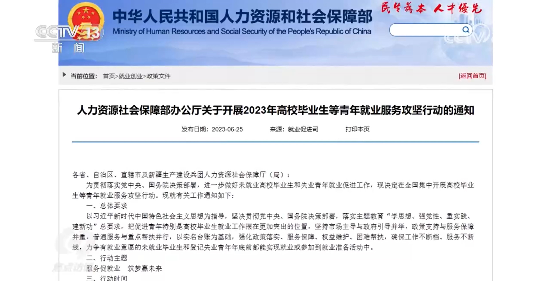 6月25日,人力资源社会保障部印发通知,部署启动2023年高校毕业生等青年就业服务攻坚行动,要求省级人力资源社会保障部门7月底前,要建立2023届未就业毕业生实名台账。