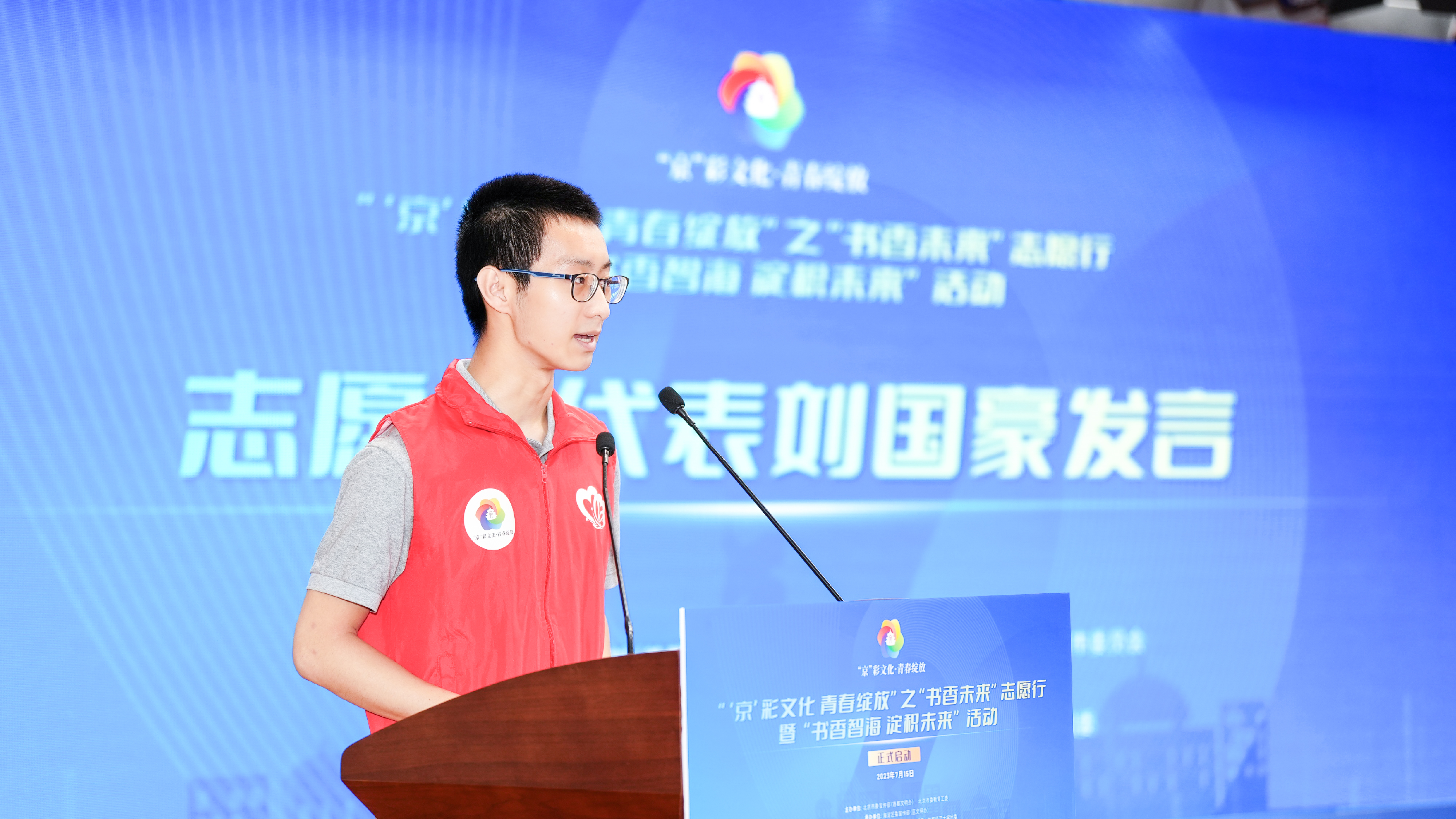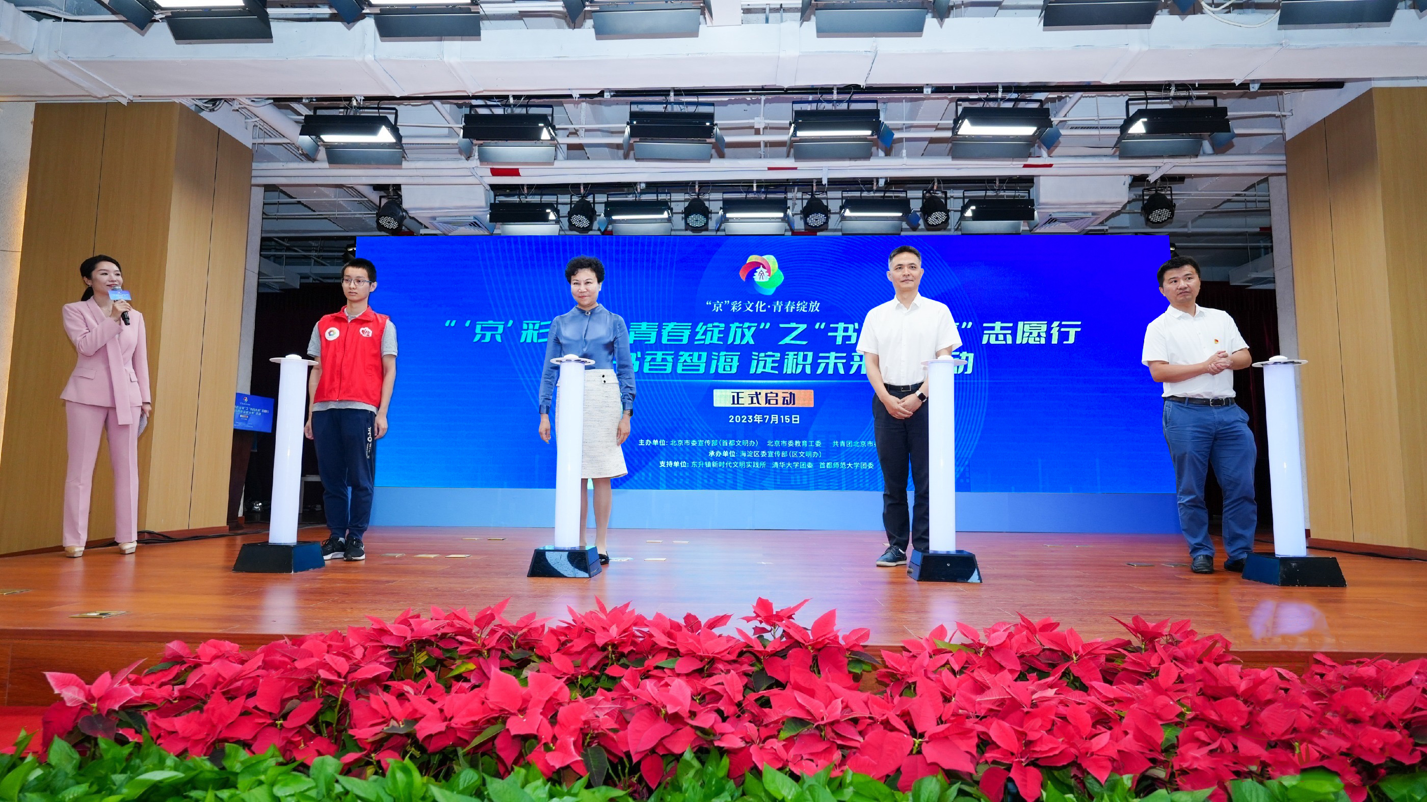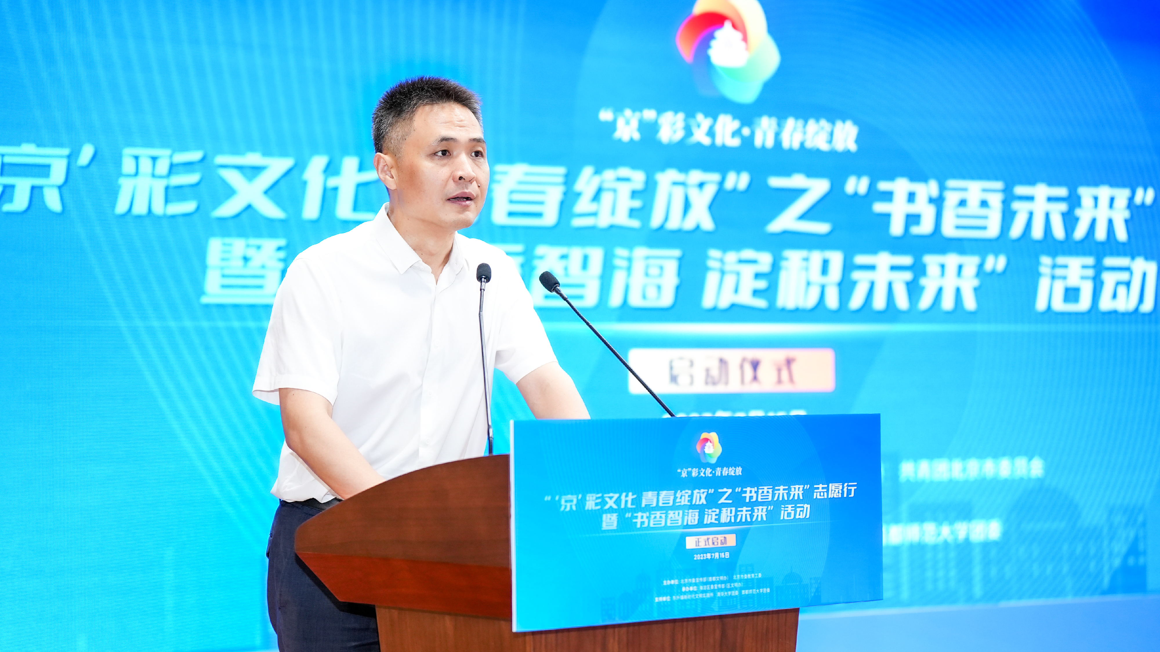 7月15日上午,由北京市委宣传部、市委教育工委、团市委主办、海淀区委宣传部承办的“‘京’彩文化 青春绽放”之“书香未来”志愿行暨“书香智海 淀积未来”活动启动仪式在海淀区东升镇举行。