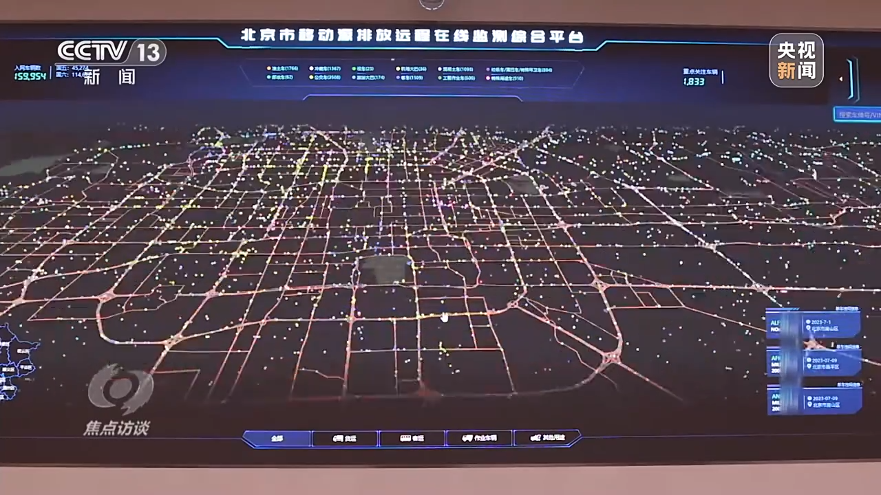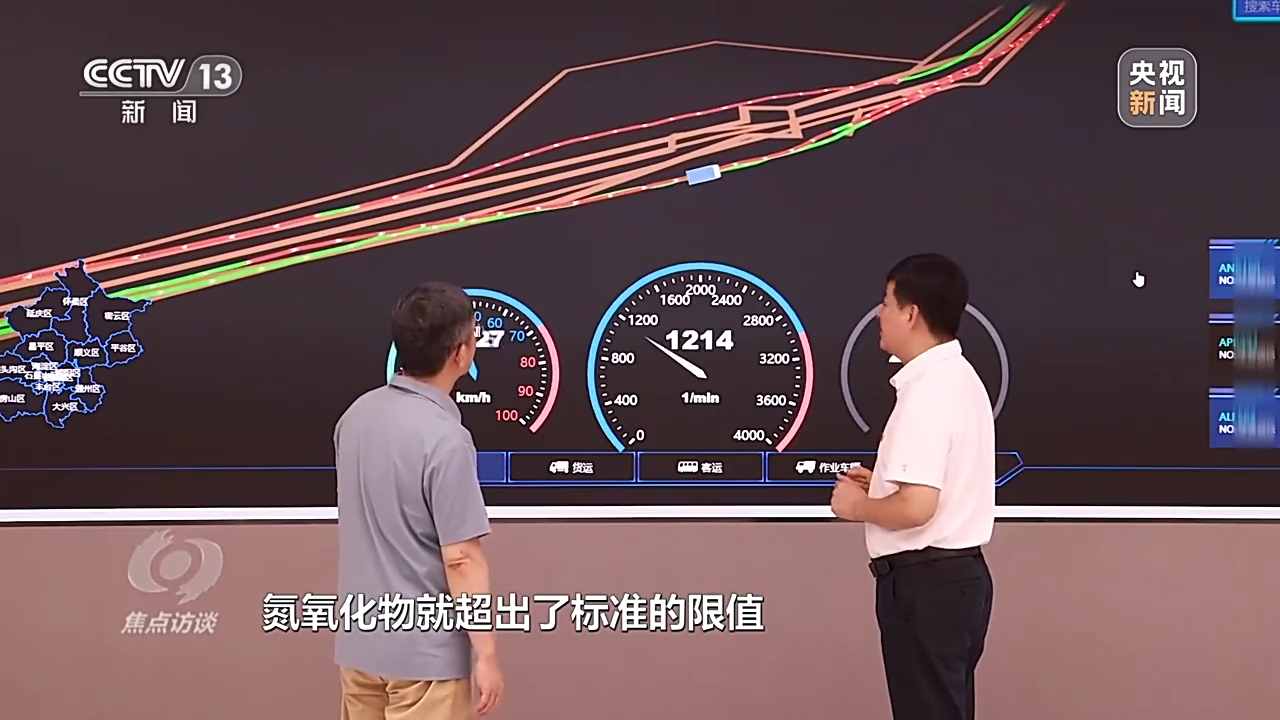 刘保献:近几年,北京市主要的重型柴油车都安装了传感器,能够实时获取每辆重型柴油车的排放情况。比如我们通过数据发现一辆氮氧化物超标的车辆,这个车在行驶轨迹上有红色、有绿色,绿色代表它达标排放,红色代表它在运行的状况下氮氧化物超出了标准限值。这样我们就能够精准定位到哪辆车超标,容易在哪个路段超标,从而达到精准管理。