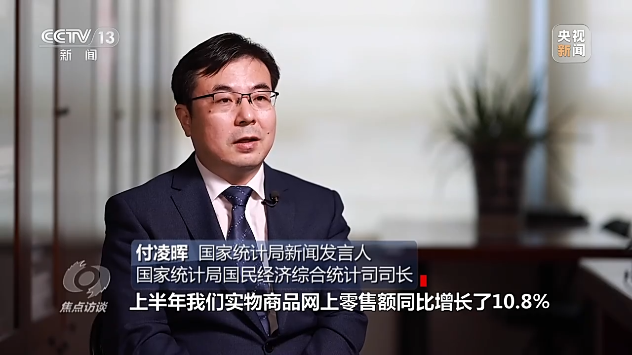 国家统计局新闻发言人、国家统计局国民经济综合统计司司长 付凌晖:上半年实物商品网上零售额同比增长了10.8%,在去年较快增长的基础上继续保持,一些即时零售,像直播带货这样的新商业模式,对消费市场带动作用也在增强。经济增长的动能在优化,发展质量在提高。