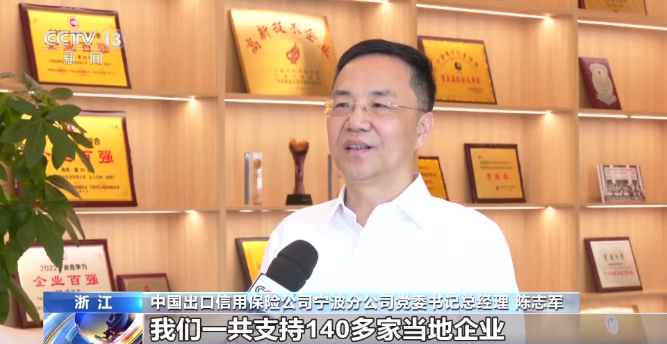 中国出口信用保险公司宁波分公司党委书记总经理 陈志军:今年上半年,我们一共支持140多家当地企业拓展国内市场,国内贸易信用保险总承保金额达到了74亿元人民币,帮助企业有效防范信用风险,支持企业内外贸一体化发展。