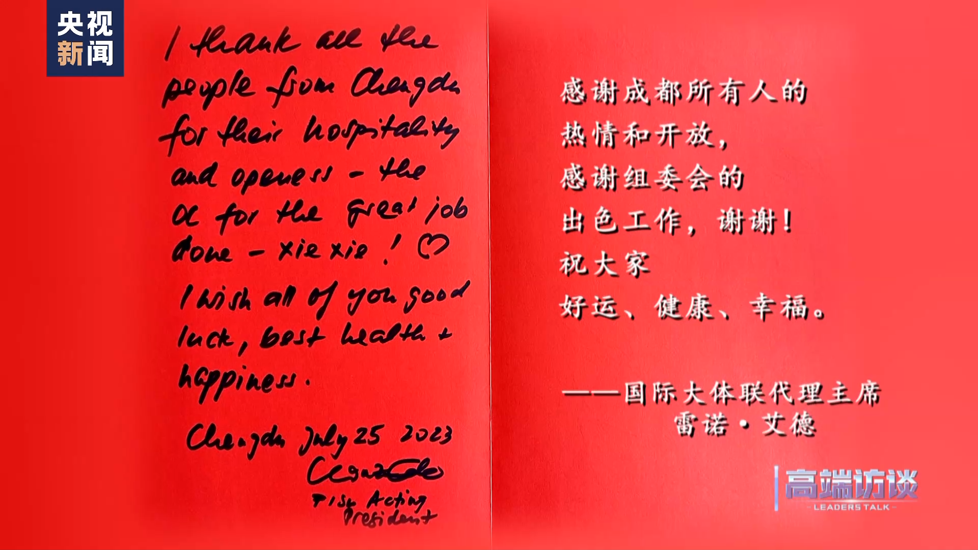 国际大体联代理主席雷诺·艾德在接受总台专访后题词:感谢成都所有人的热情和开放,感谢组委会的出色工作,谢谢!祝大家好运、健康、幸福。