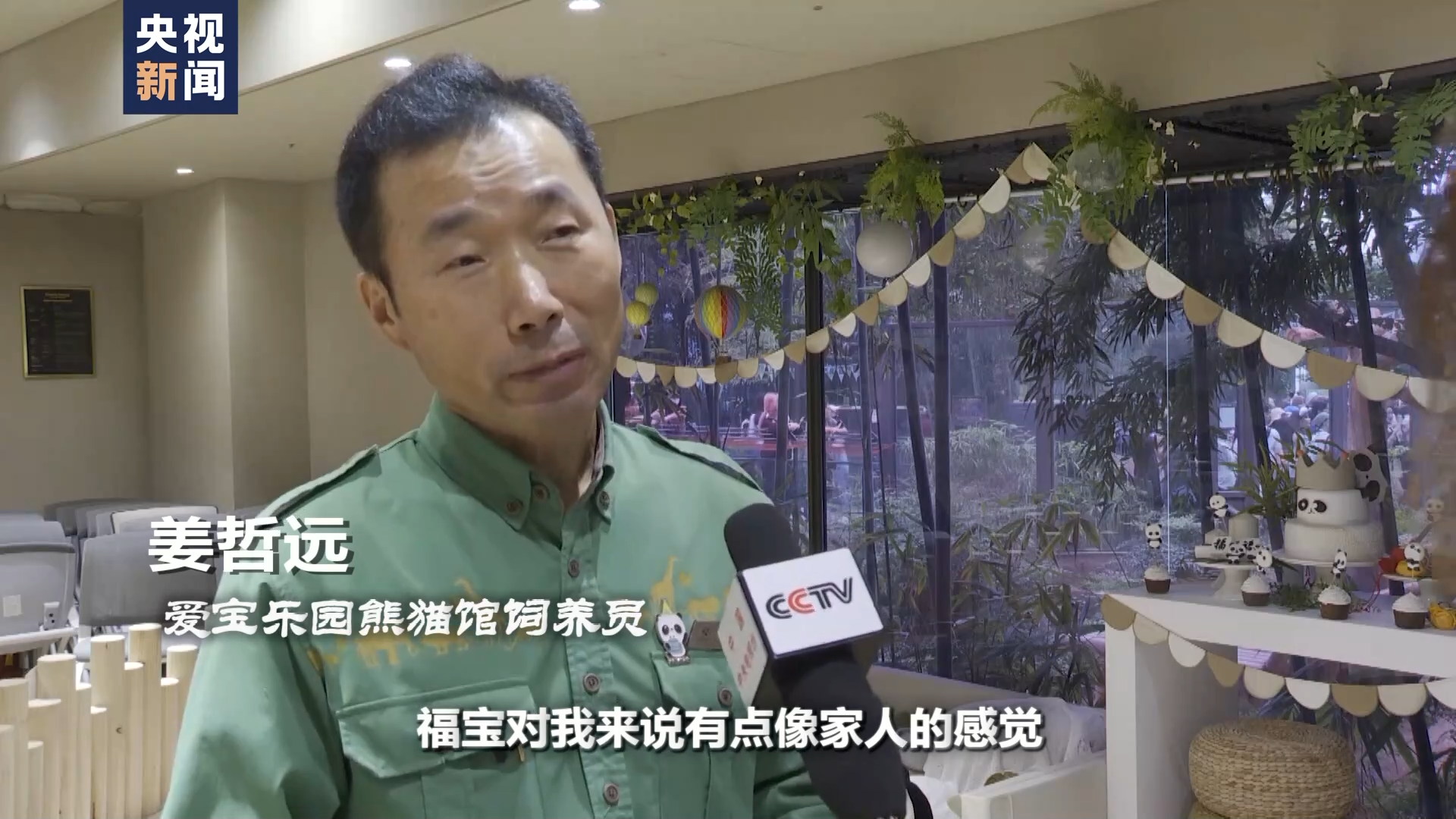 爱宝乐园熊猫馆饲养员 姜哲远:福宝对我来说有点像家人的感觉,我在动物园已经工作了30多年。这样看来,动物们就是我的朋友。我们的宝家族真的有家人的感觉,首先爱宝、乐宝、福宝的名字都是有含义的,就像它们名字的意思一样,它们是可爱又给我带来快乐的宝物。可爱的宝物还有幸福的宝物,对我来说,它们是熊如其名,像家人一样的宝贝。