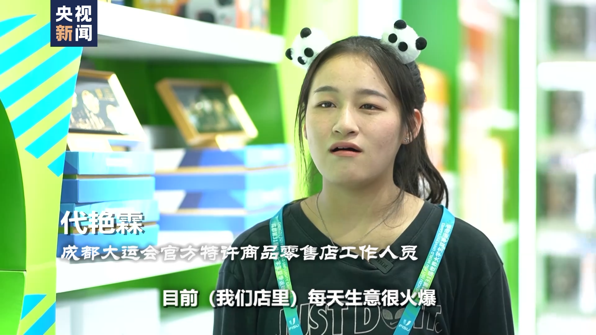 成都大运会官方特许商品零售店工作人员 代艳霖:目前(我们店里)生意非常火爆,大概每天要接待10万顾客。为了方便顾客了解我们的产品,我们会采取一个限流的措施,大概50个人限流一次,方便我们给顾客详细介绍我们的产品。