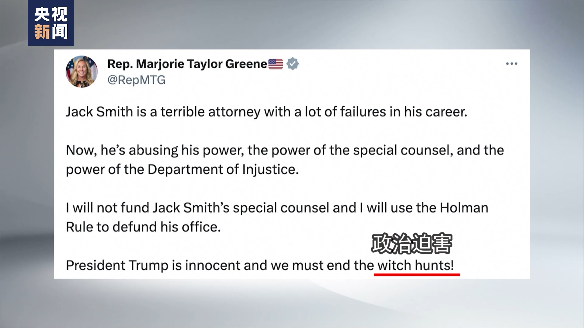 但是,在特朗普以及共和党人看来,民主党人的做法是将司法武器化,是在试图打击他的选情。共和党议员玛乔丽·格林发文,指责美国司法部特别检察官杰克·史密斯是在滥用职权,针对特朗普的刑事指控是“政治迫害”行为。