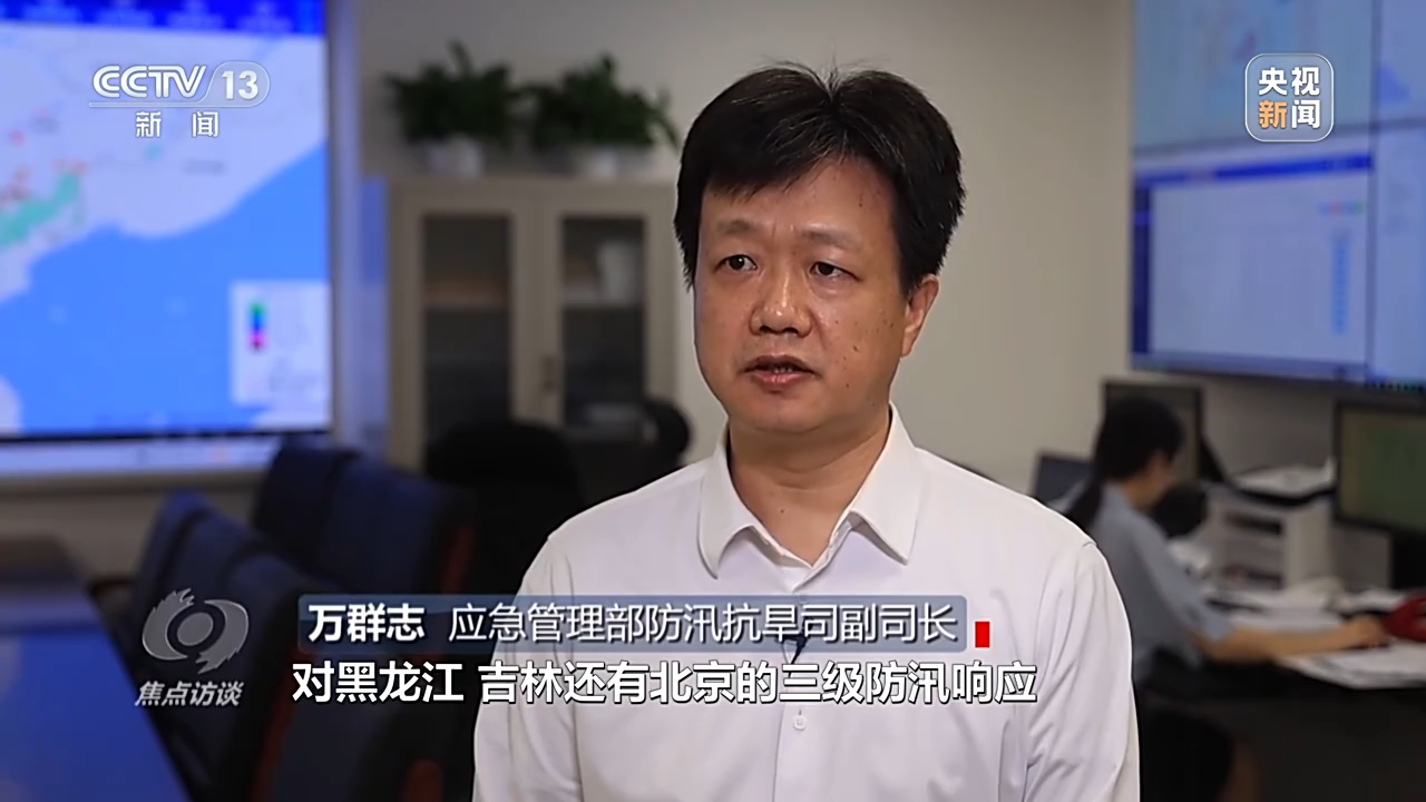应急管理部防汛抗旱司副司长 万群志:当前,国家防总仍然维持河北、天津防汛二级响应,黑龙江、吉林、北京三级防汛响应,派出了十个工作组在一线指导,同时给五个省、分九个批次调拨了价值5700余万元的防汛抢险物资,来支援地方抢险救援。