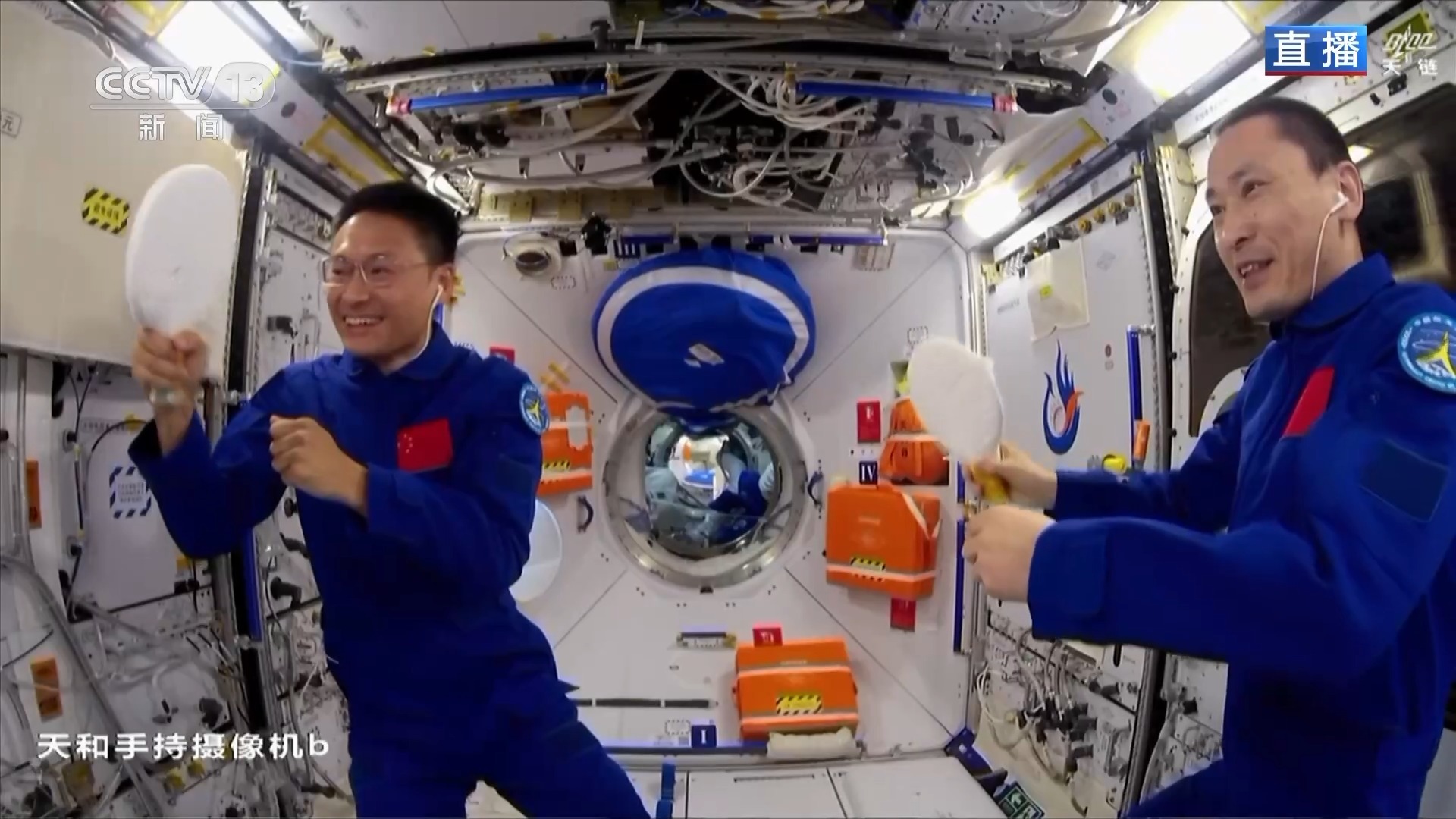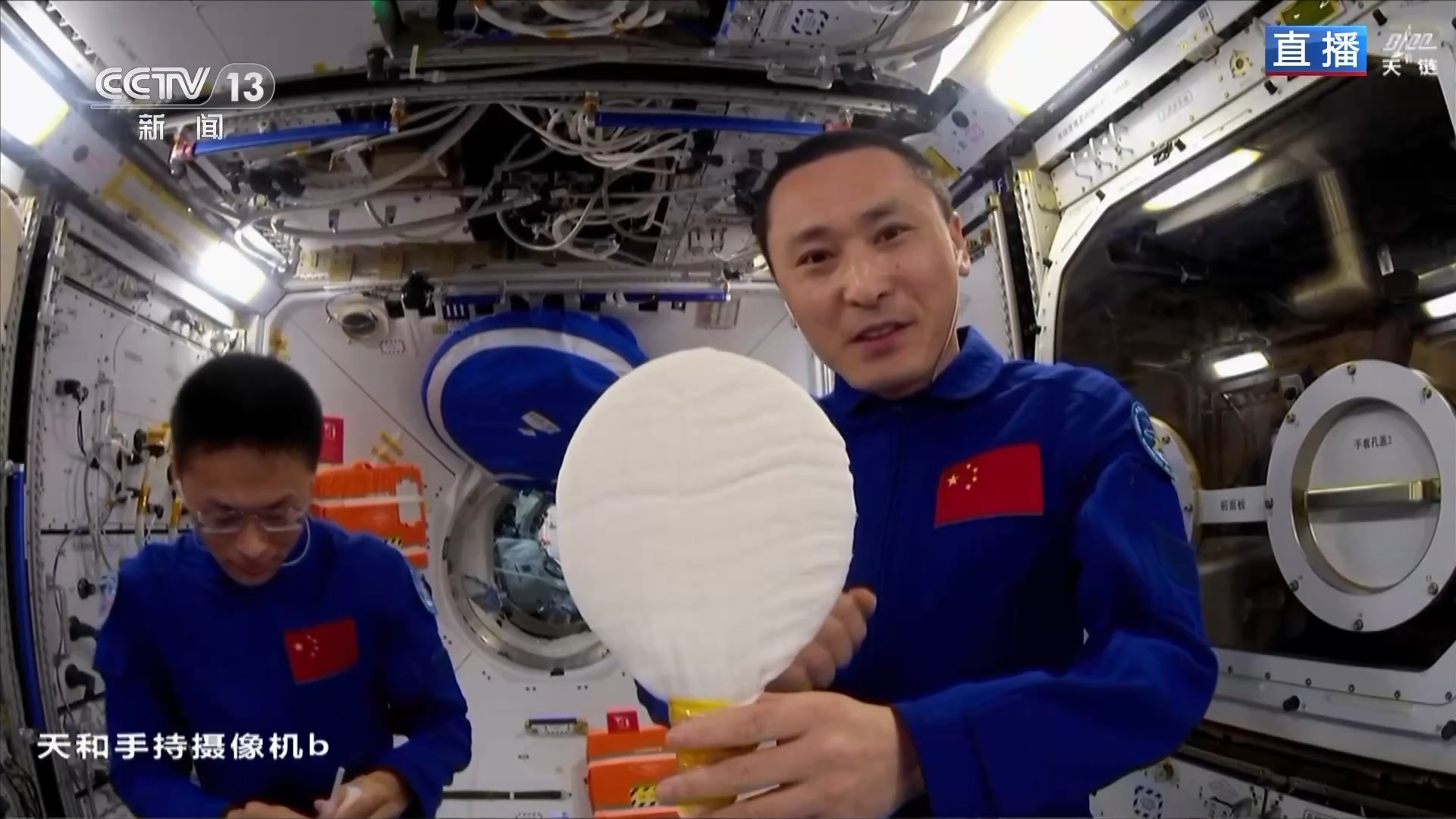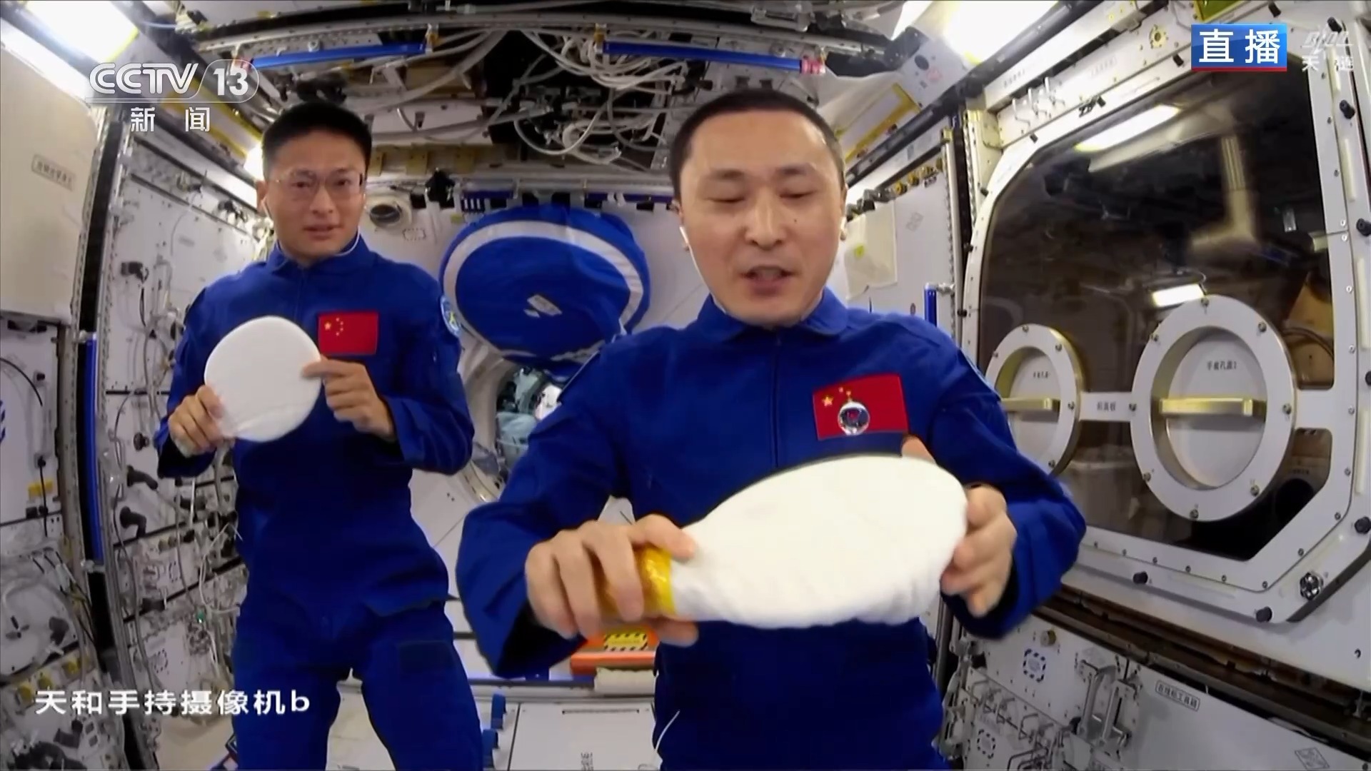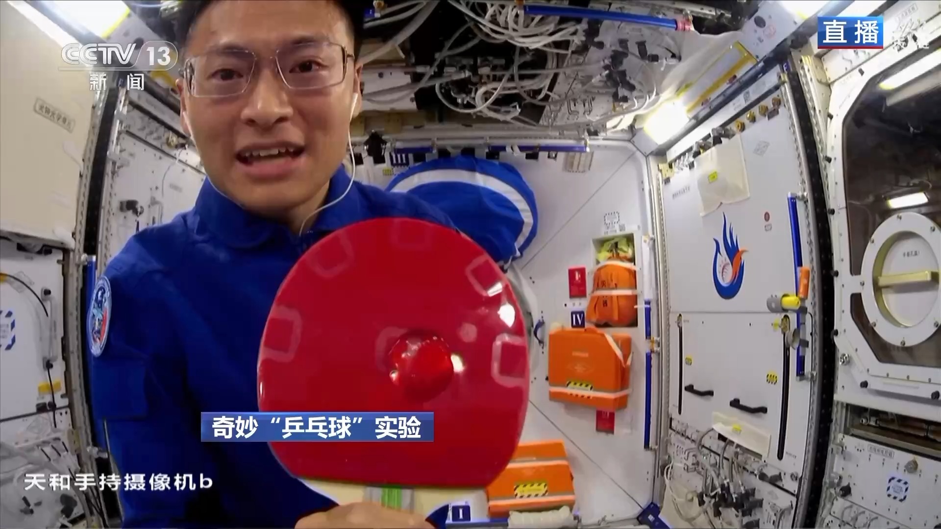 航天员 朱杨柱:同学们注意观察,球体碰到我的球拍没有破裂,也没有沾到毛巾表面,而是呢,像乒乓球一样弹开了,现在桂老师也准备好了,我们试试看能不能对打一下。