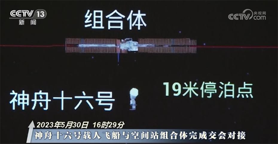 2023年5月30日16时29分 神舟十六号载人飞船与空间站组合体完成交会对接