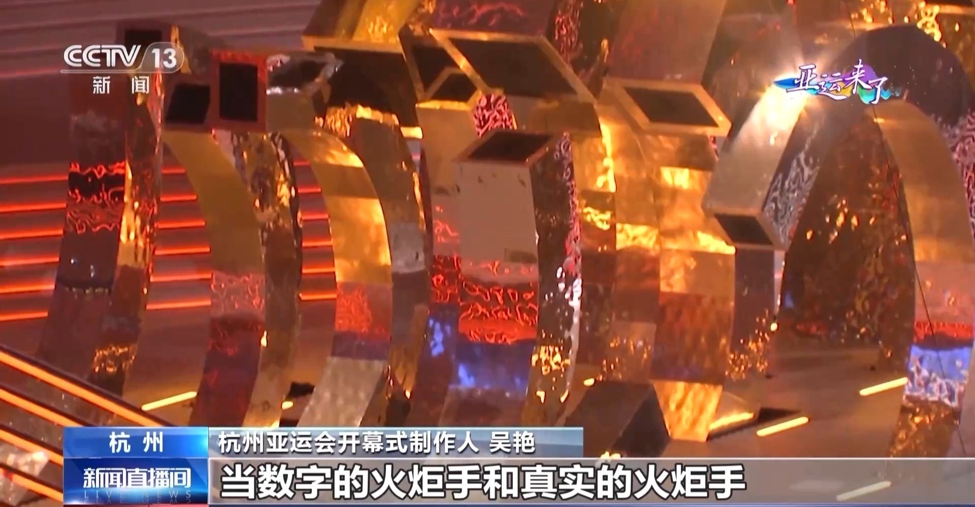 杭州亚运会开幕式制作人 吴艳:当数字的火炬手和真实的火炬手,大家一起站在这个地方,去点燃这个火炬的时候,可以看到,它(主火炬装置)是在徐徐地展开的,会给大家一个完全不一样的惊喜。