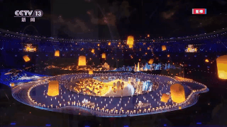 湖光山色又变幻成为雄伟宽阔的京杭大运河,游船驶入大运河,不远处,就是杭州拱宸桥。灯笼飞起,祝福满天,《灯火耀古今》。在这一刻,古今相会,四海同心,友谊长存。