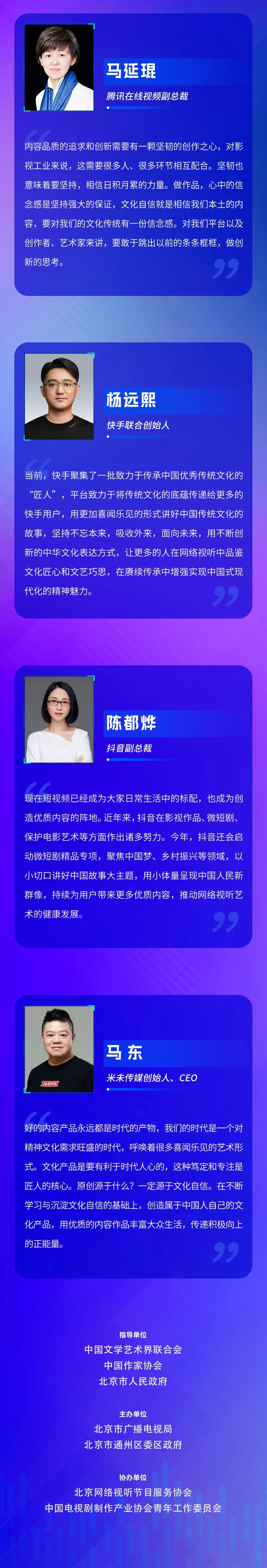 “网络视听是技术驱动的行业,科技创新正在引发内容领域生产方式和生产关系的深刻变革。”爱奇艺创始人、首席执行官龚宇表示,在网络视听艺术创作的版图里,人的智慧、创意和人格魅力依然是内容生产的最重要的价值和核心竞争力。网络视听艺术创作,归根结底要坚持精品化多元化方向。好内容是网络视听行业的核心竞争力,是科技创新应用、人才发掘培养的目的,也是媒体融合发展、推动业态创新的起点。