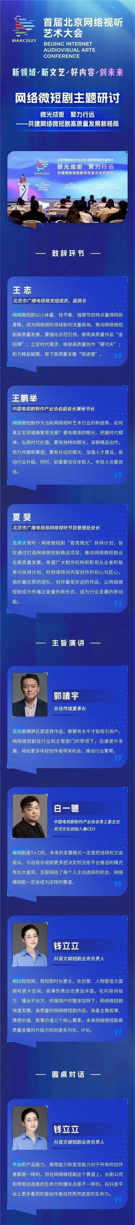 9月26日下午,首届北京网络视听艺术大会网络微短剧主题研讨在京成功举行。本次研讨以“微光成炬,聚力行远——共建网络微短剧高质量发展新格局“为主题,发布北京大视听•网络微短剧“首亮微光”扶持计划,相关部门领导、各重点平台及各制作机构相关负责人围绕“迭代2.0,微短剧的进阶与升维”“长短互促,共创未来”等主题进行圆桌对话。