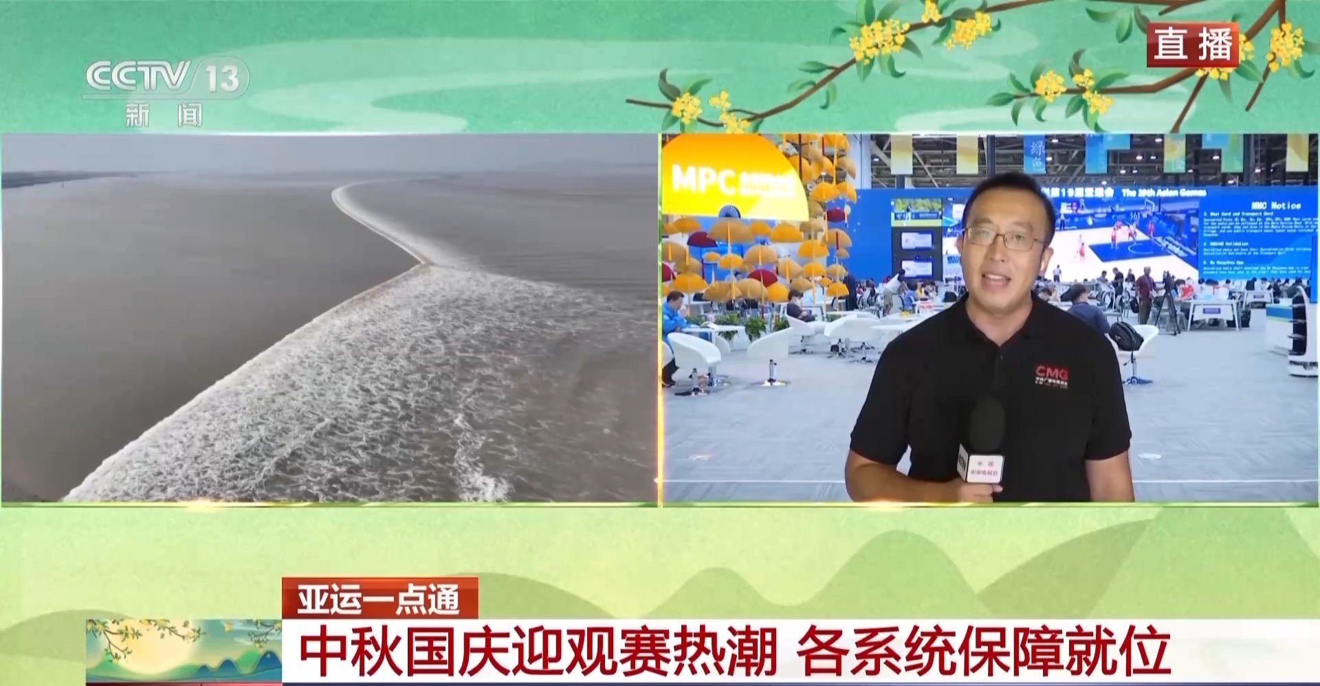 总台央视记者 黄达:随着中秋的到来,大潮也来了。就在昨天,中外媒体30多名记者共同前往了海宁感受钱塘大潮。体验了一番潮起亚细亚的壮阔魅力。当亚运遇上中国潮,在这里,我也想跟大家分享一下,这几天我在亚运赛场内外感受到别样的“潮”。