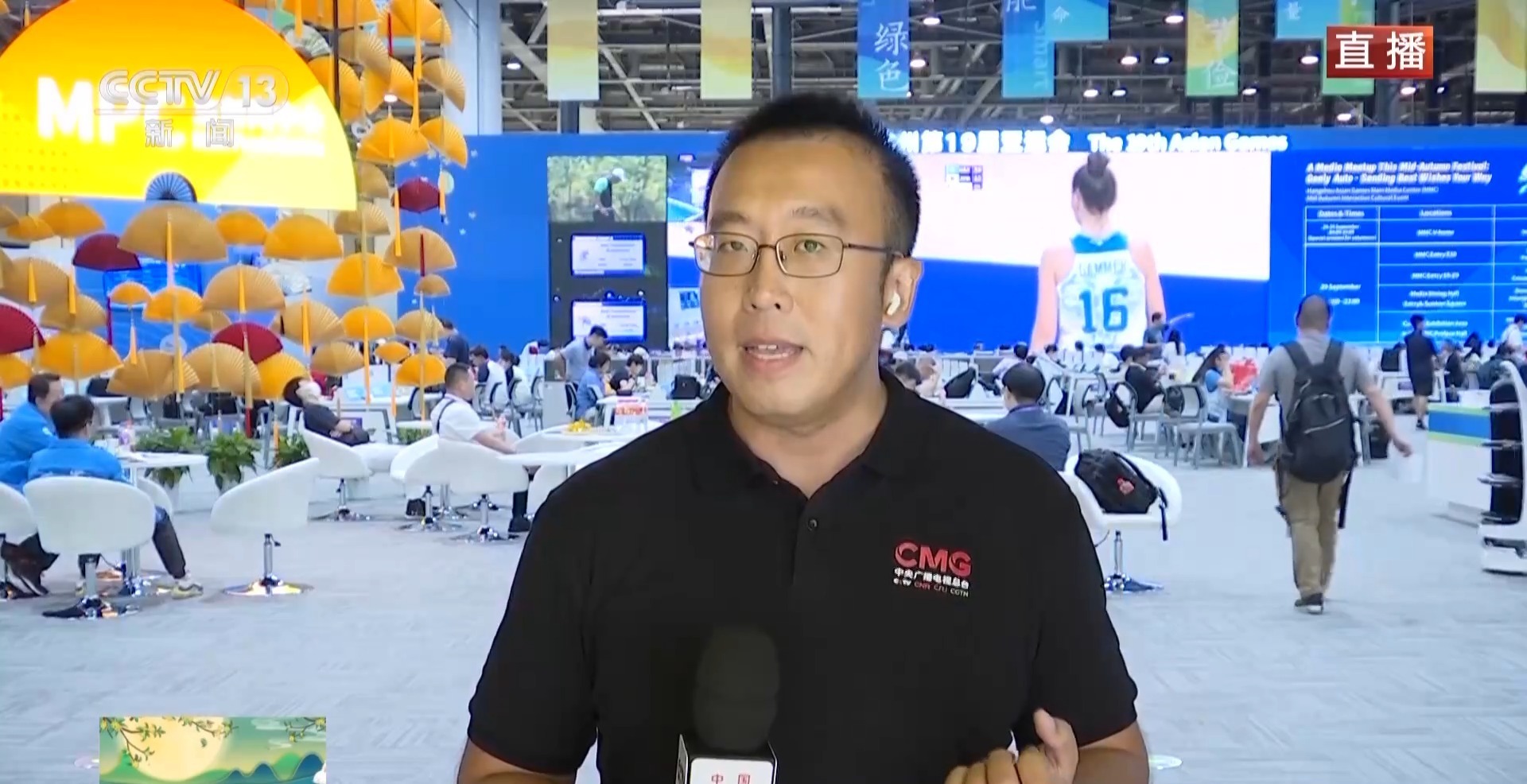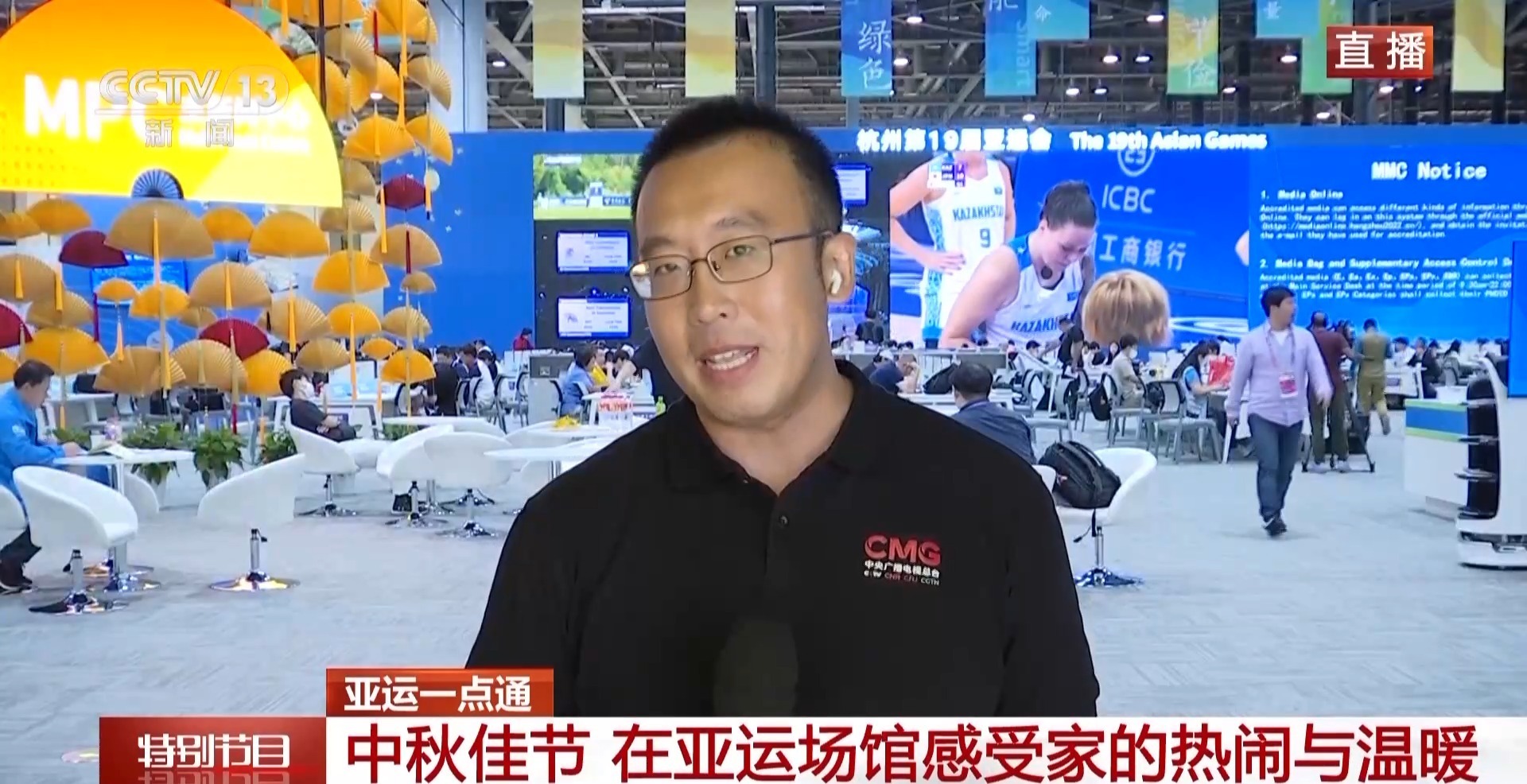 总台央视记者 黄达:今天(29日)是中秋节,在主媒体中心,在亚运村,都能感受到浓浓的中秋气息。就在今天,运动员走进运动员餐厅就会收到由嫦娥仙子送出的月饼,晚上的时候也将举行文化市集,届时这里将进行赛场之外最为激烈的比赛,比如,筷子夹月饼,到底谁会胜出呢?谁做的花灯会最受欢迎?这些赛事的成绩都将在今晚揭晓。虽然在中秋节,大家暂时无法与家人团聚,但是在这个亚运大家庭里,大家依然可以感受到家一样的热闹与温暖。
