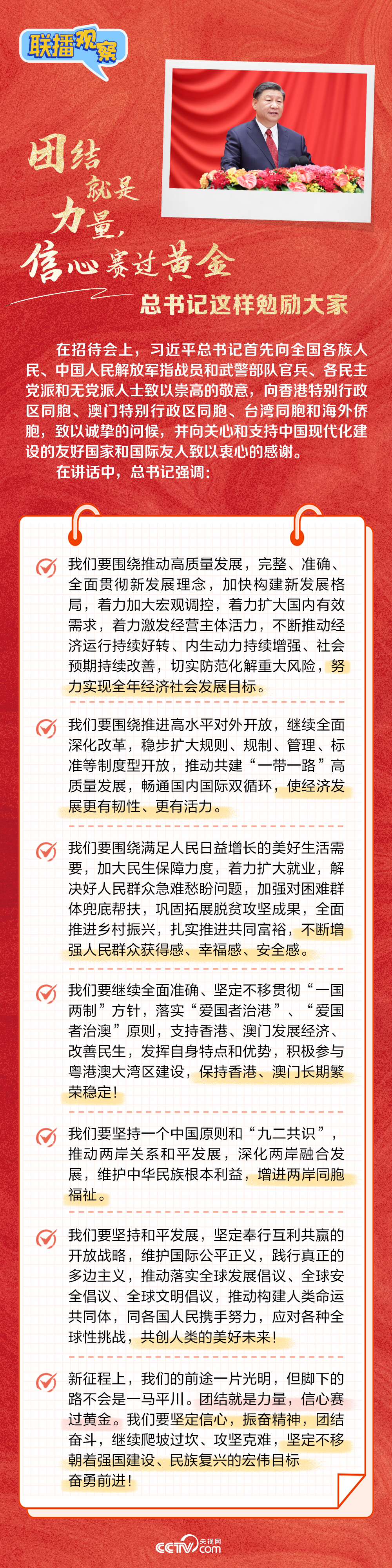 在欢快的乐曲声中,中外宾朋举杯共贺中华人民共和国成立74周年。作为一场“简约而不简单”的高规格国宴,习近平总书记在讲话中强调了哪些重点内容?国庆招待会的餐桌有哪些亮点细节?都有哪些新朋旧友出现在招待会上?央视网《联播观察》与您一同“云参会”。