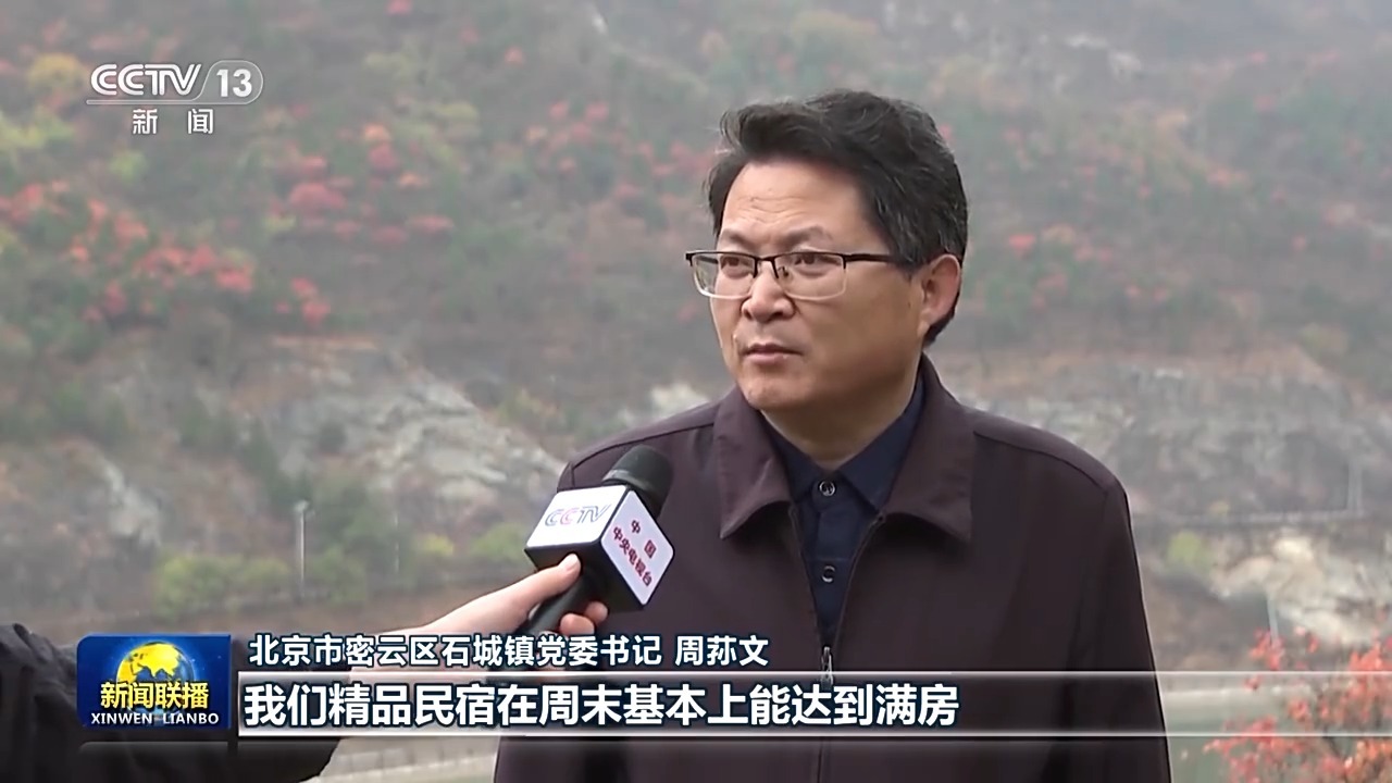 北京市密云区石城镇党委书记 周荪文:金秋赏叶季,我们最高峰一天能达到1.2万游客。我们精品民宿在周末基本上能达到满房。通过发展生态休闲旅游,将生态优势转变为发展优势,我们全镇得到了大实惠,我们也真真切切感受到绿水青山就是金山银山。