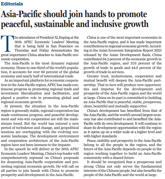 亚太经济合作组织第三十次领导人非正式会议在美国加利福尼亚州旧金山举行。中国领导人应邀出席会议,并将发表重要讲话,彰显中国对亚太经济合作的高度重视。