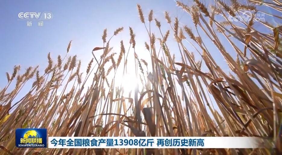 央视网消息(新闻联播):国家统计局今天(12月11日)发布全年粮食产量数据,2023年全国粮食总产量达13908.2亿斤,再创历史新高,连续9年稳定在1.3万亿斤以上。