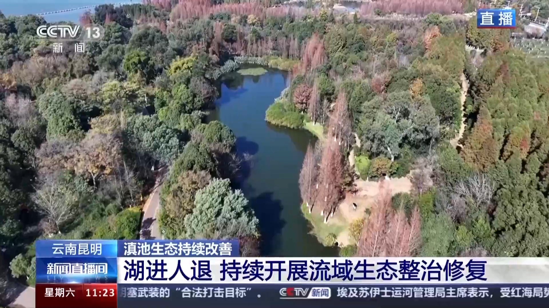看完了水面,我们再把视线转到湖滨一带。蓝天碧水间,连片红色、黄色的水杉相互映衬,非常显眼,也给冬天的美景中增添了一抹亮色。这些湿地水杉可是环滇池生态带的重要组成部分。截至目前,建成滇池环湖生态带面积6万多亩。