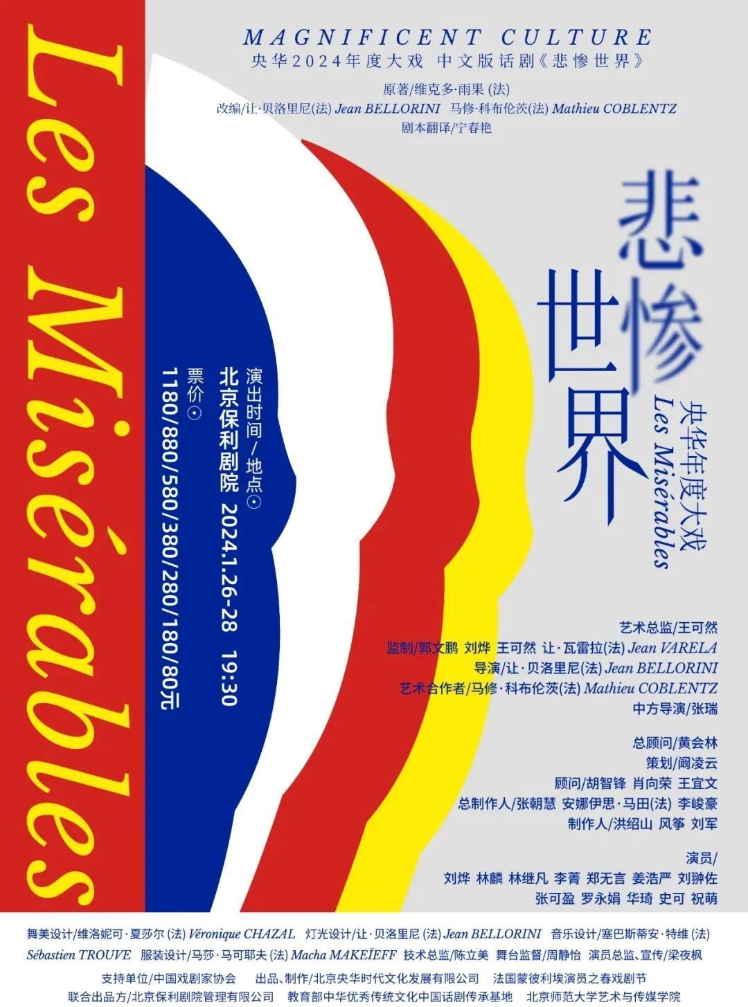 本剧创作团队集结了全球顶尖的艺术力量,汇聚了中法两国的艺术实力。欧洲著名导演让·贝洛里尼执导,央华艺术总监王可然担任艺术总监,来自中法两国的张朝慧、安娜伊思·马田、李峻豪出任总制作人团队。著名演员刘烨12年后再演话剧,将冉·阿让这一处于时代浪潮中命运跌宕起伏的传奇人物进行深刻诠释,为世界戏剧舞台再增添一个冉·阿让的经典版本。