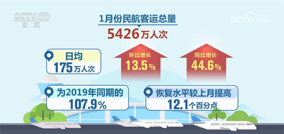 央视网消息:今年1月份我国民航旅客运输量明显提升,国际客运市场恢复水平不断提升。