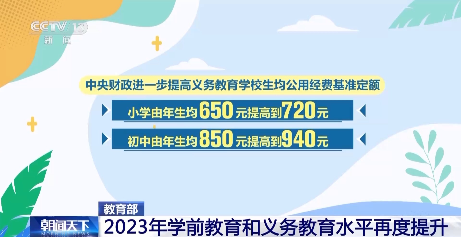 2023年,中央财政进一步提高义务教育学校生均公用经费基准定额,小学由年生均650元提高到720元,初中由年生均850元提高到940元,支持学校更好落实“双减”政策、提升课后服务水平;各地加快办好群众“家门口”的新优质学校。据初步统计,2023年全国新增义务教育优质学校1736所,新增优质学位199.9万个。全国共有1.6万个义务教育阶段教育集团和1.5万个城乡学校共同体。