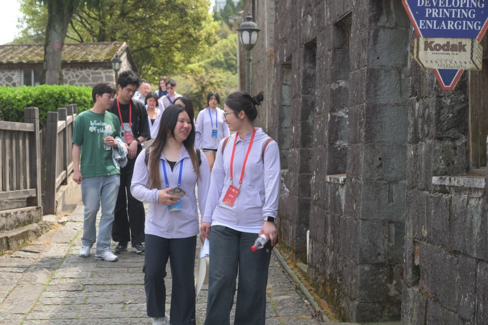 3月25日,福州大学外国语学院学生(前右)与美国太平洋大学学生(前左)在福州鼓岭老街漫步交流。