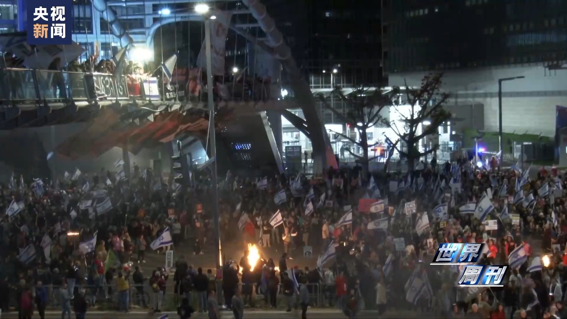 3月23日,以色列特拉维夫。数千名以色列民众封堵了市中心的马路,点燃了火堆,示威抗议要求以政府在加沙停火,尽快促成被扣押人员获释,并要求内塔尼亚胡辞职。